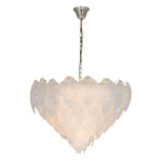 Its cascading silhouette is adorned with textured glass panels, each designed to mimic the delicate form of mulberry leaves. The layered arrangement creates a dynamic interplay of light and shadow, adding depth and movement. Nickel finished metalwork provides a refined contrast, enhancing the chandelier’s luxurious appeal.