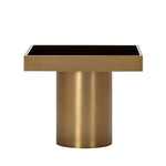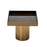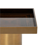 Its cylindrical base is finished in brushed brass and provides a strong foundation, while the square tabletop is beautifully accented with a matching trim for a cohesive, architectural look. Made from smoked eucalyptus, the tabletop showcases an intricate marquetry pattern, adding texture and depth to its luxurious finish.