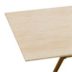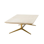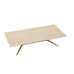 Its smooth beige travertine top showcases natural textures, adding warmth and elegance to any space. The brushed brass-finished stainless steel legs provide a striking contrast, combining durability with a sleek, sophisticated aesthetic. With clean lines and a timeless silhouette, it effortlessly complements both casual and formal settings.