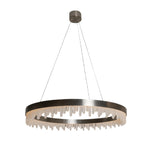 Its sleek nickel-finished frame features a minimalist circular design, adorned with cascading crystal-like accents that refract light into a radiant, ethereal glow. Suspended from elegant wires, it adds a touch of sophistication to living rooms, dining rooms, or entryways, effortlessly complementing modern and transitional interiors.