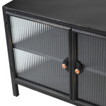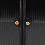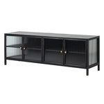 Standing on four, sleek legs, this chunky iron cabinet boasts a powerful presence. Four ribbed glass doors open to reveal convenient shelving to keep all your DVDs and video games organised and out of the way whilst its top is smooth and spacious – perfect for displaying your prized TV. Extending to the sides of the unit, its ribbed glass allows for an obscured view of its contents, and two golden handles complete the design with an opulent gleam.