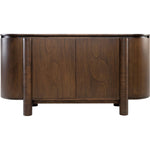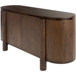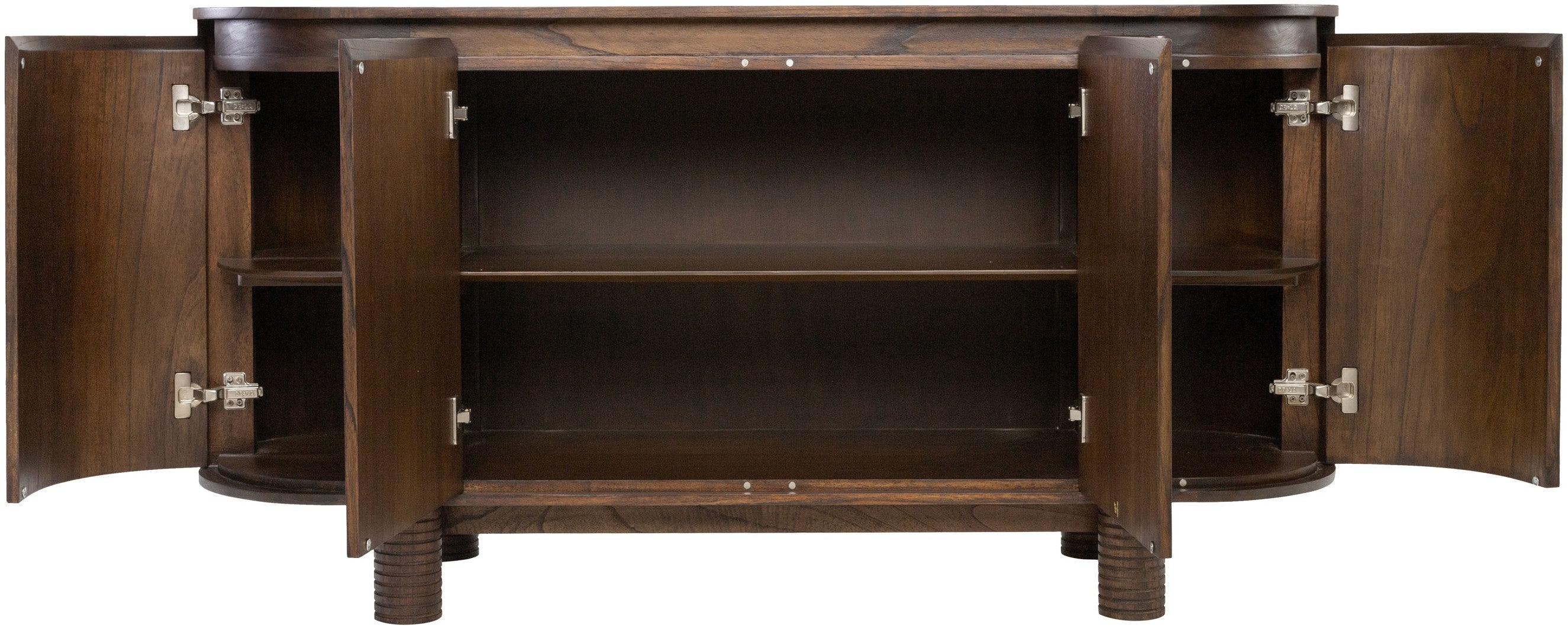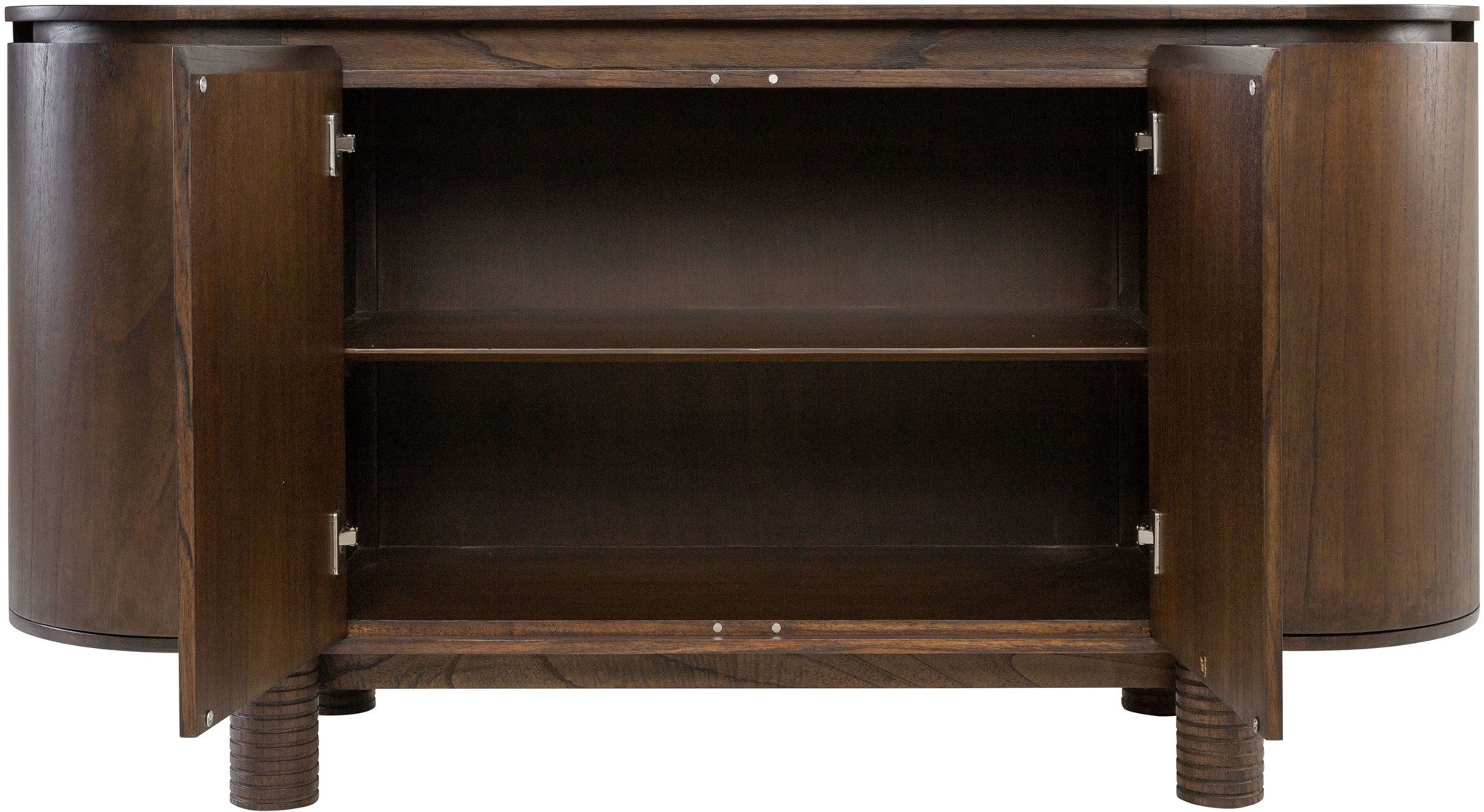 With its mindi wood build and roasted coffee finish, this sideboard seamlessly blends form and function. Its pill-shaped surface offers an ideal stage for displaying treasured photos or eye-catching décor whilst four cylindrical legs punctuated with ribbed details inject a dash of visual flair. Concealed behind four doors, spacious shelving provides ample room for stowing crockery, books or other essentials.