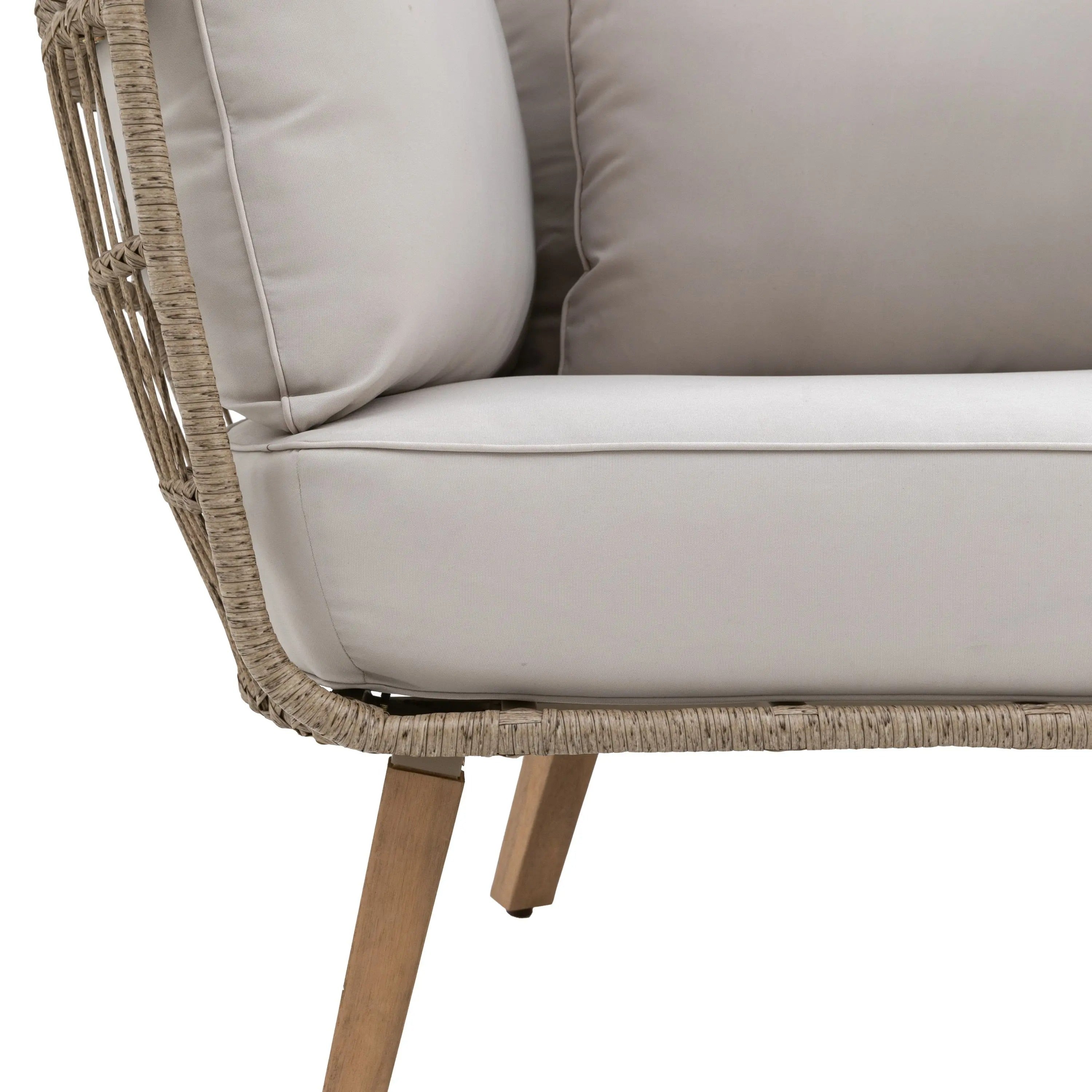 Supported by sturdy wooden legs, it features a natural wicker frame that forms a cocoon-like haven – perfect for curling up with a good book or simply unwinding in style. Plush cushions complete the look, offering comfort and support that invite hours of relaxation.