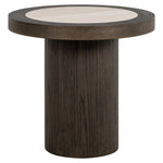 Its bold circular base, crafted from recycled wood and oak veneer in a rich dark brown finish, offers a grounded, organic feel. The tabletop, featuring a travertine-effect ceramic centre framed by a matching wooden trim, creates an elegant contrast of tone and material.
