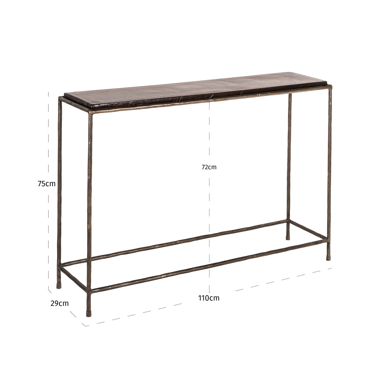 A slim, bronze-finished iron frame creates a refined architectural silhouette, whilst a coloured glass top that adds rich, glossy depth making it ideal for elevating hallways, living rooms and dining areas. The long, streamlined surface offers plenty of room for styling with your choice of decor, while the open base keeps the look light and spacious.