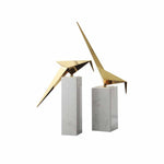 The Alma Bird sculpture is a delicate beauty that will stand pride of place on your shelf, console, or display cabinet. Crafted from brass finished metal, it possesses the distinctive appearance of an origami bird with its crisp, sharp folds. A block of smooth, white marble elevates the bird, adding a touch of depth when paired with the smaller Alma Sculpture. As a treat for yourself or a gift for a loved one, it is uniquely lovely.