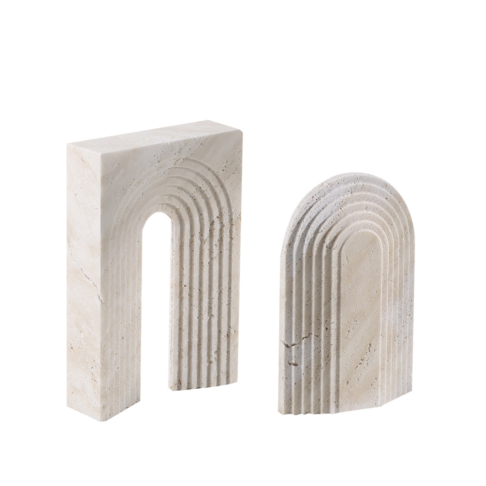Drawing inspiration from Art Deco aesthetics, this exquisite sculpture is more than just a decorative item – it's a conversation piece. Expertly crafted from beautiful beige travertine, the arched form of this sculpture is accentuated by stepped layers, creating a fascinating interplay of depth and dimension.