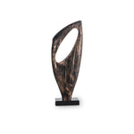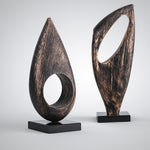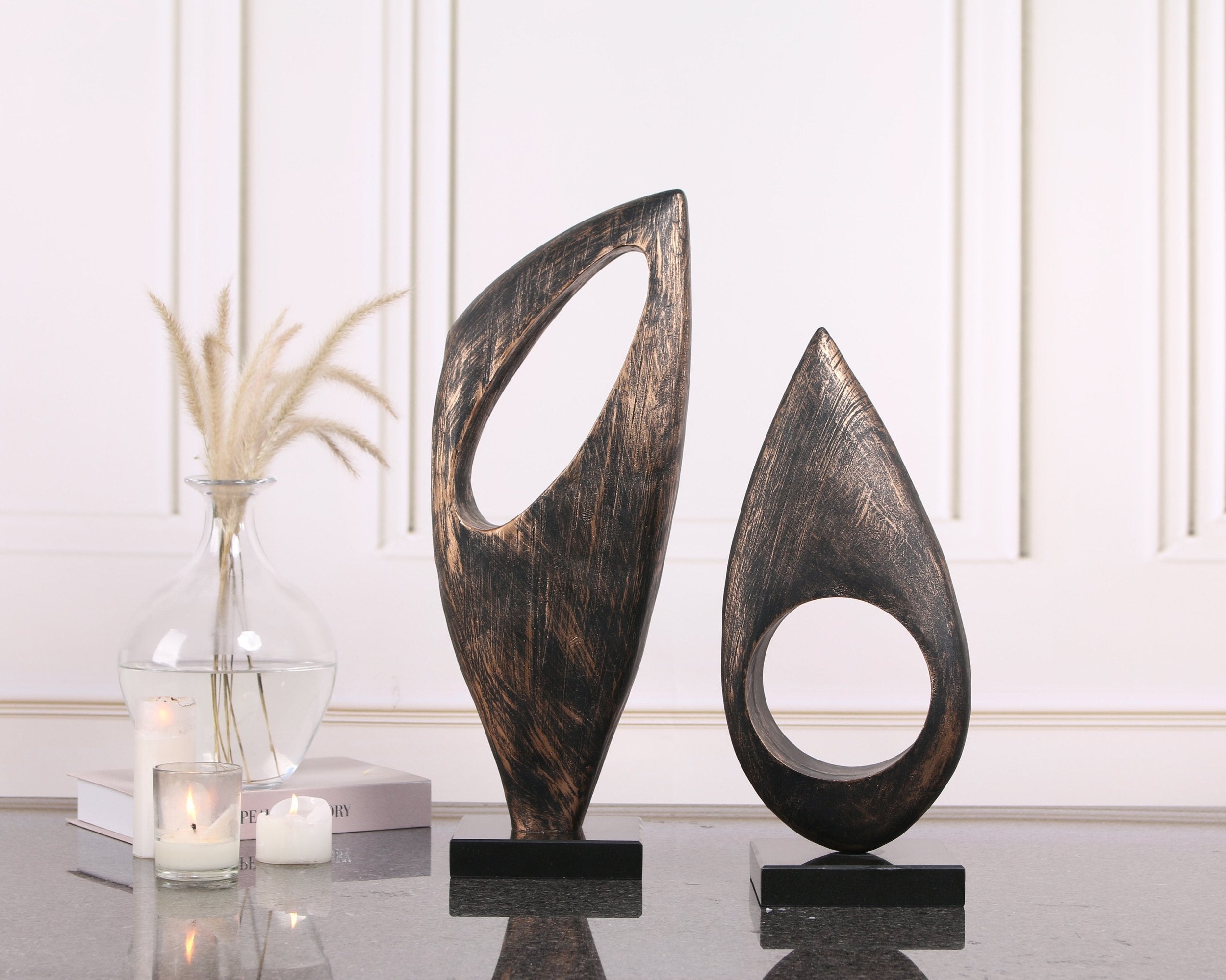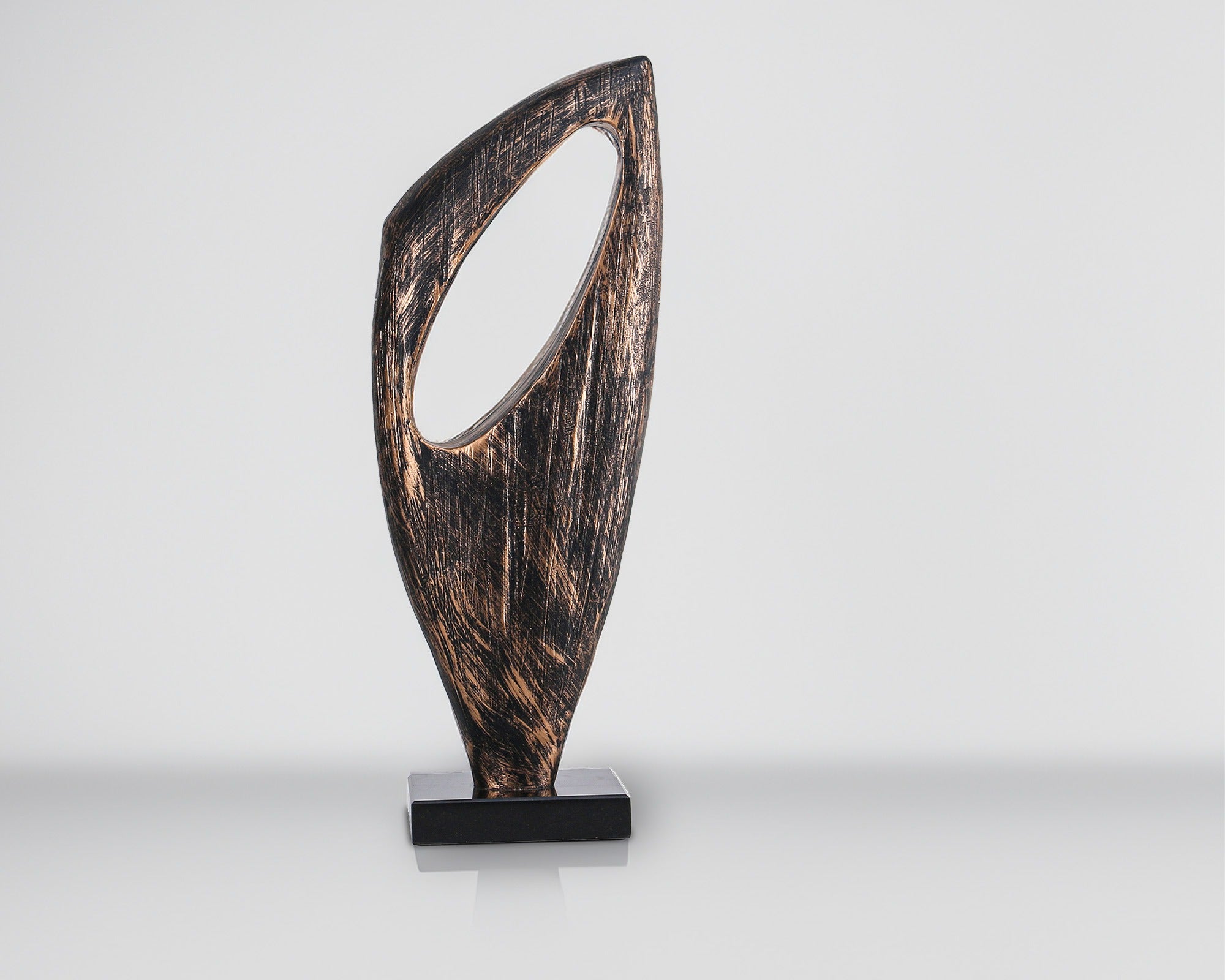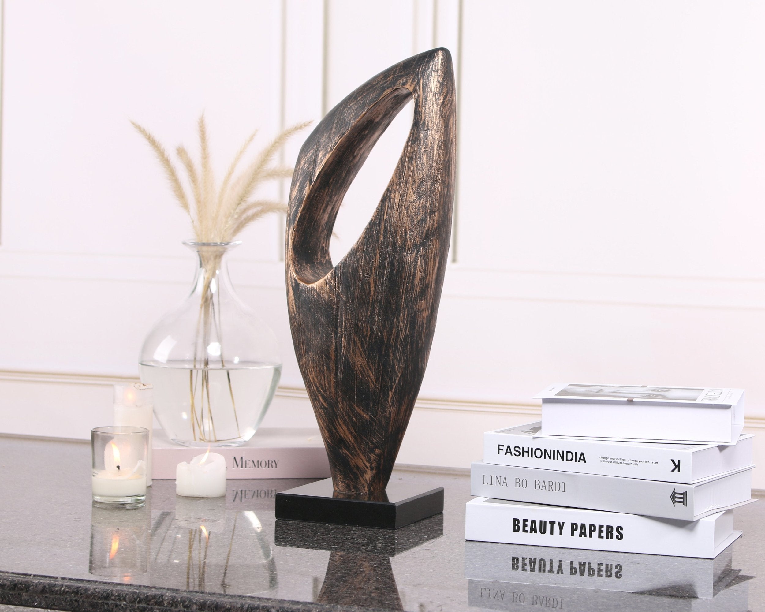 Standing proudly on a sleek marble base, this resin masterpiece boasts smooth curves that makes use of negative space for a striking geometric aesthetic. Its rough, antique bronze finish exudes a sense of age and timelessness, adding layers of intrigue to its design.
