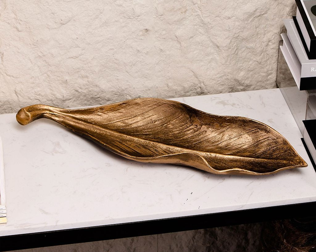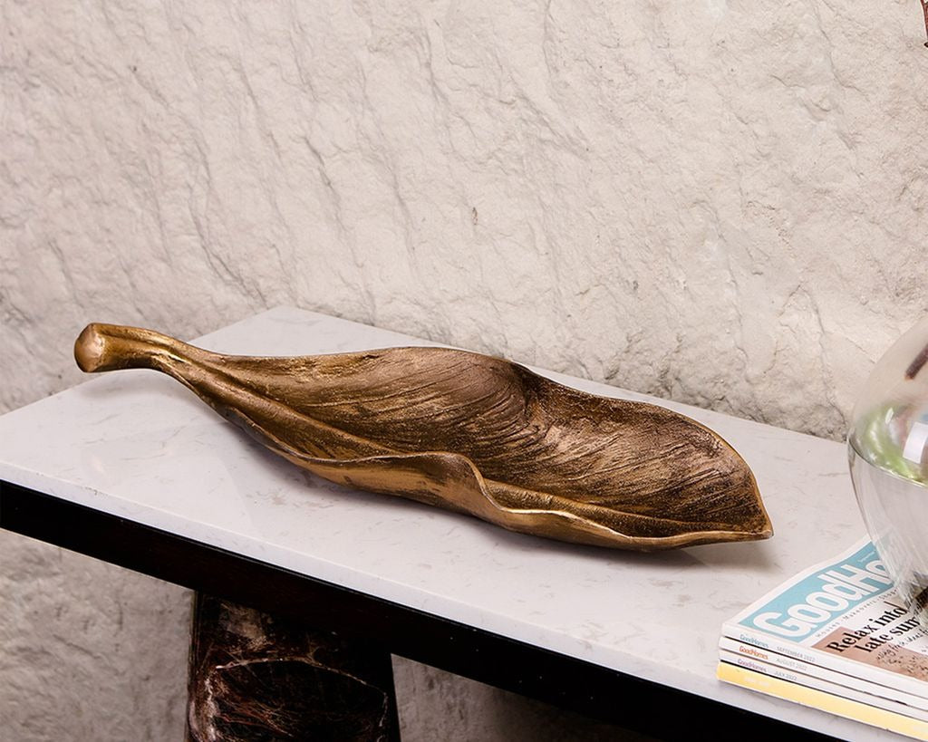 Crafted from golden bronze aluminium, its flowing form and delicate veining capture the essence of organic movement with a luxurious finish. The sculptural curves invite both touch and admiration, making it a striking accent piece for coffee tables, consoles or dining tables.