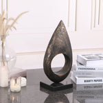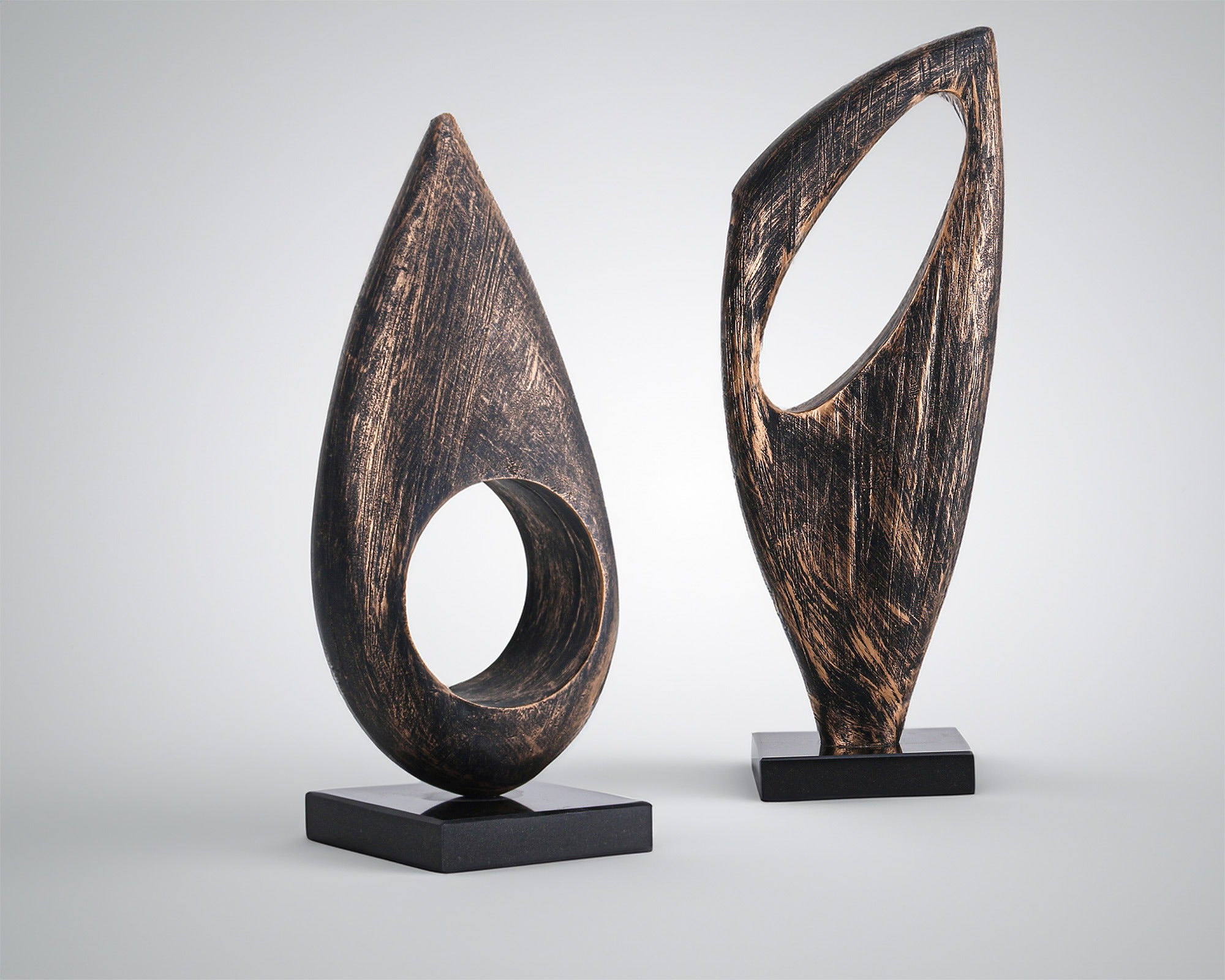 Standing proudly on a sleek marble base, this resin masterpiece boasts smooth curves that makes use of negative space for a striking geometric aesthetic. Its rough, antique bronze finish exudes a sense of age and timelessness, adding layers of intrigue to its design.