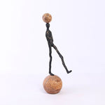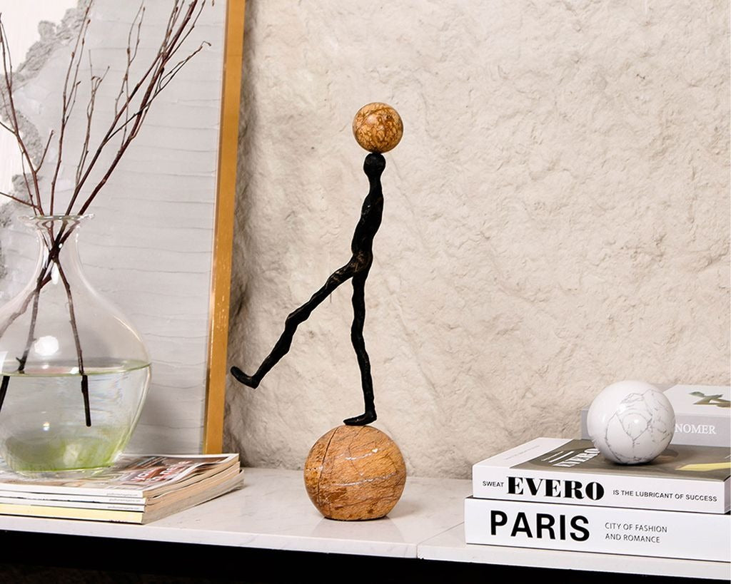 Cast in dark bronze aluminium, its slender abstract figure balances gracefully atop a polished marble sphere, creating a captivating interplay of texture, form and material. The poised, dynamic posture captures movement frozen in time, making it a striking focal point for contemporary interiors. Smooth marble contrasts elegantly with the rich bronze finish, adding tactile sophistication and visual depth.