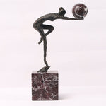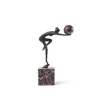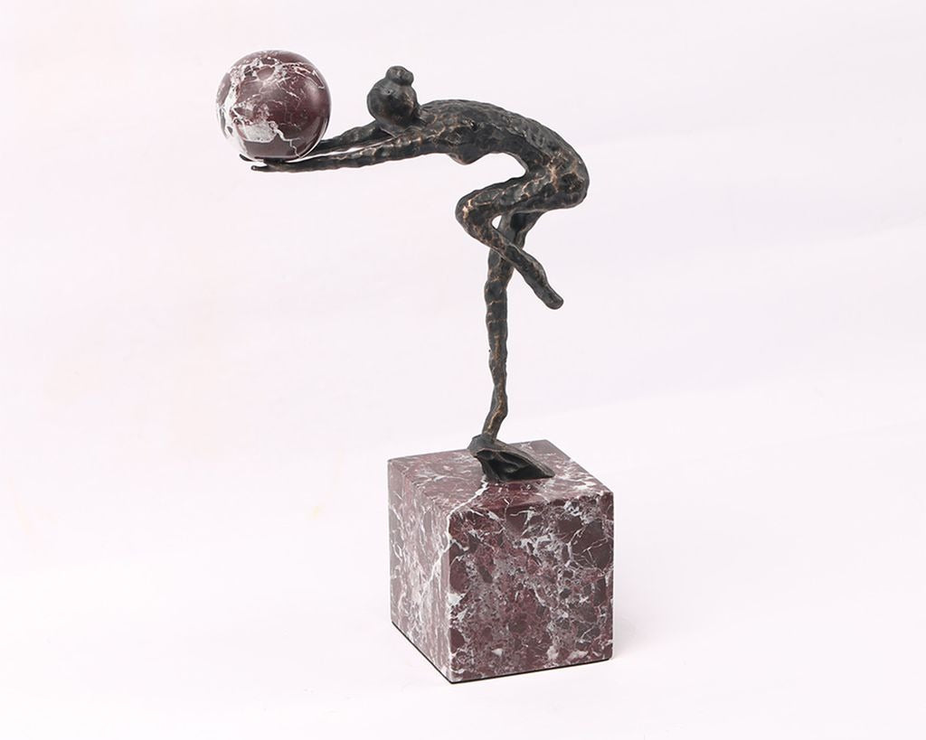 Crafted from dark bronze finished aluminum, its elongated form is stylised yet fluid, leaning forward to hold an exquisite marble sphere in a gesture that feels both graceful and symbolic. The rich marble base adds contrast and weight, reinforcing its sculptural presence with a sense of timeless sophistication.