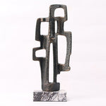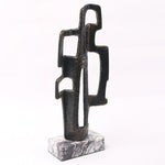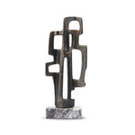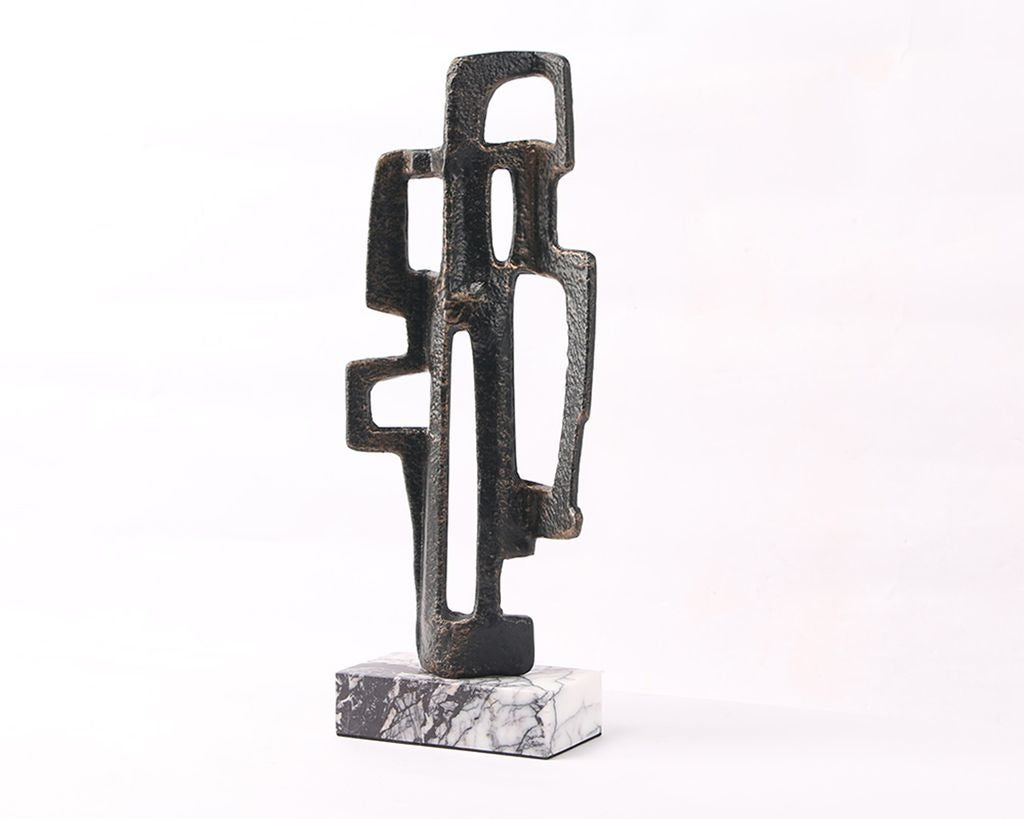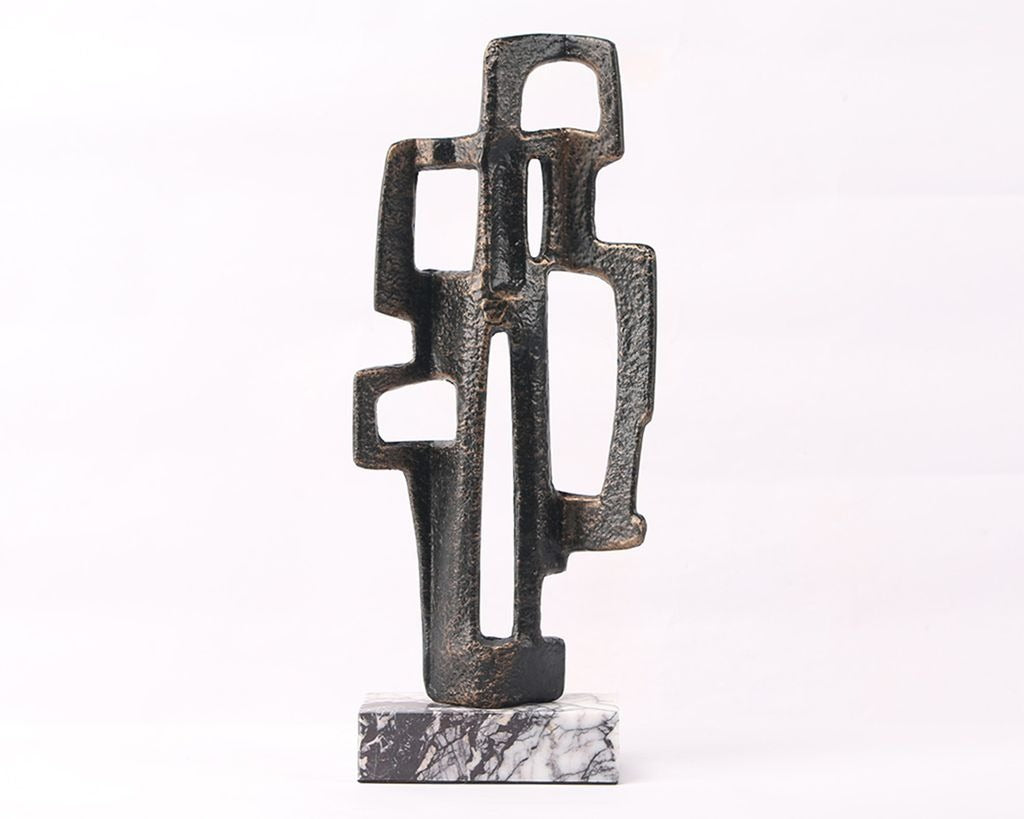 Set atop a solid marble base, its dark bronze aluminium form explores the relationship between positive and negative space, with geometric voids and angular lines creating a strong sense of movement. The result is a visually arresting piece that resonates with contemporary style.