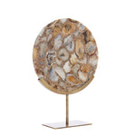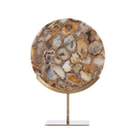 Supported by a metal surround and base, both of which have been finished in antique bronze, a disc made from yellow agate takes centre stage as a stunning ornamental piece. Brimming with contemporary appeal, it boasts an impressive style that allows it to stand out on any shelf or console. A gorgeous design that will catch the eye in an instant.