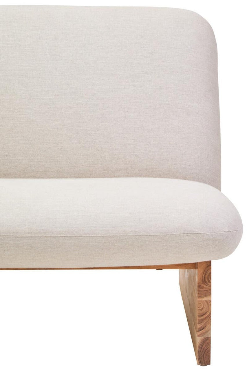 Its clean, armless design and soft cream linen upholstery create an airy, understated aesthetic that feels both inviting and versatile. A solid base crafted from mango and acacia wood introduces organic texture and tonal depth, grounding the look with natural warmth. The sleek silhouette and tactile materials lend a calming presence, making it an ideal addition to neutral, pared-back spaces.
