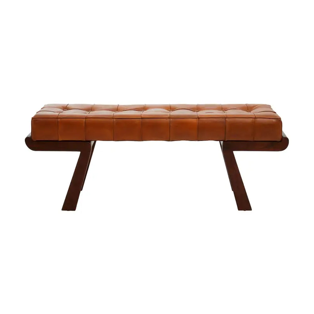 This bench features a luxurious button-tufted seat, upholstered in genuine brown leather, offering both style and durability. The warm tones of the leather are beautifully complemented by its sturdy cedar wood frame, showcasing an elegant angular base design. This bench is not just a piece of furniture, but a versatile addition to any home or commercial space.