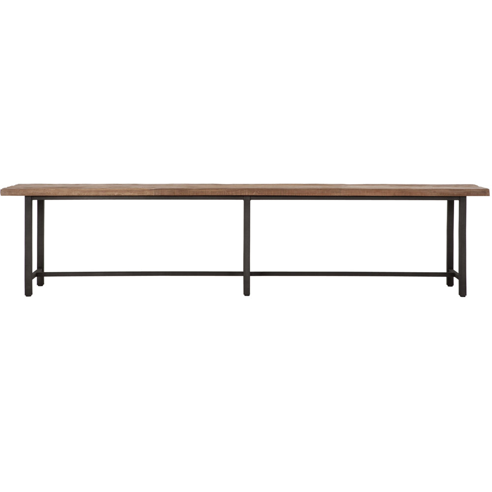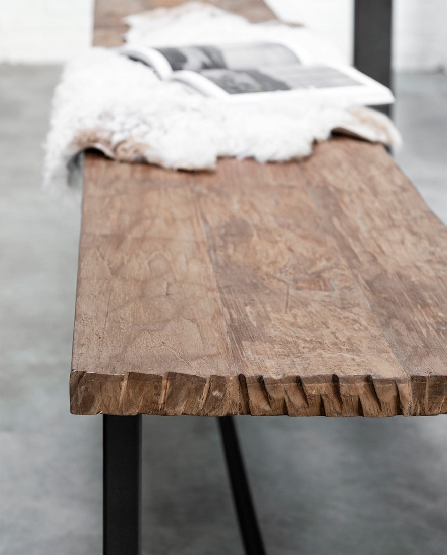 Mounted on sleek metal legs with a reinforcing bar for enhanced stability, this bench carries a distinctive industrial allure. Its top, crafted from natural recycled teak wood features a clear varnish that beautifully showcases the wood's natural, rustic charm whilst offering protection.