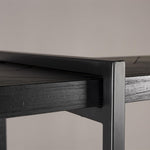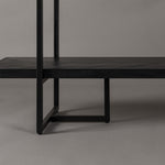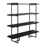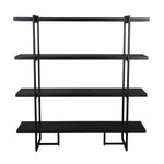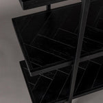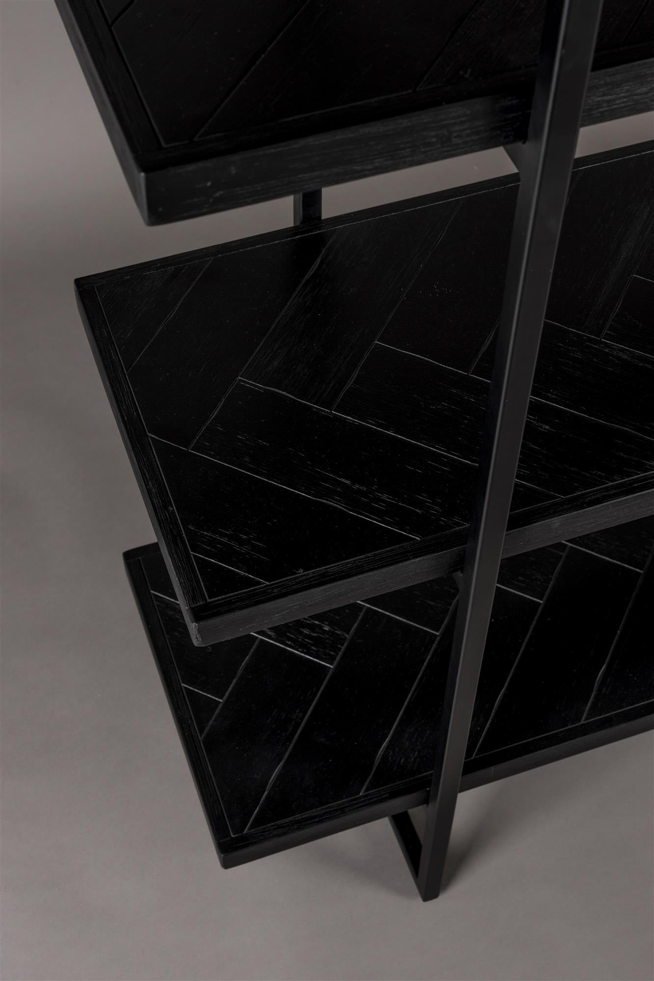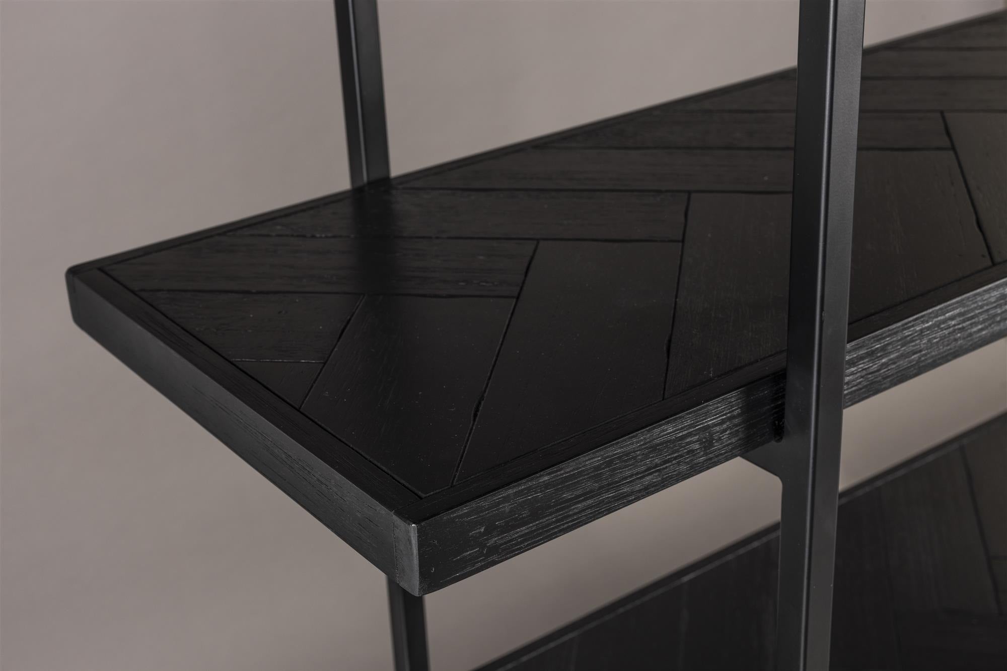 Standing tall with black-finished metalwork, its open framework creates a light, airy presence that works beautifully as a display unit, bookshelf, or open storage solution. The acacia veneer shelves, each featuring a herringbone pattern, provide a sturdy and elegant platform for books, ornaments, or treasured photographs.