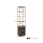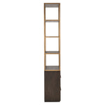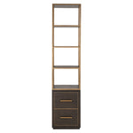 Crafted from a blend of plywood, oak, and oak veneer, it features a rich dark brown finish framed by sleek brass metalwork for a touch of contemporary elegance. Two drawers open to reveal generous hidden storage, while four open shelves provide ample space to showcase books, ornaments, or treasured photographs.