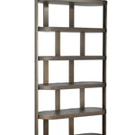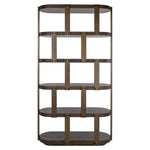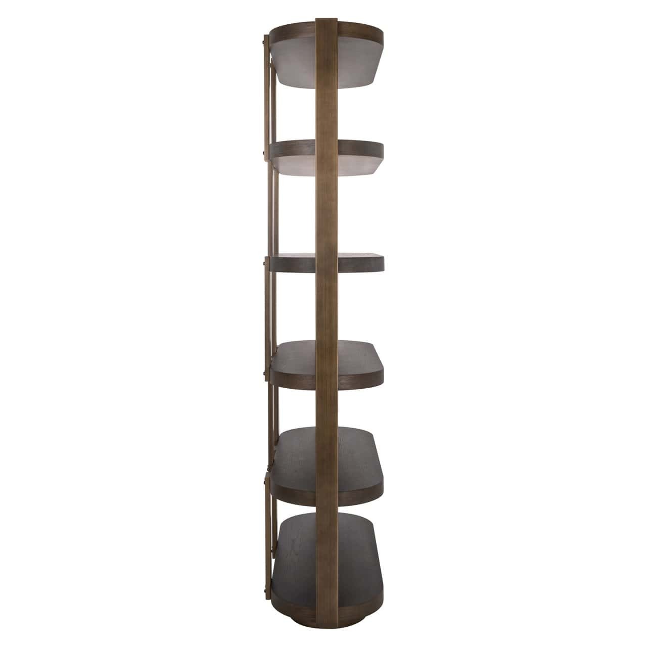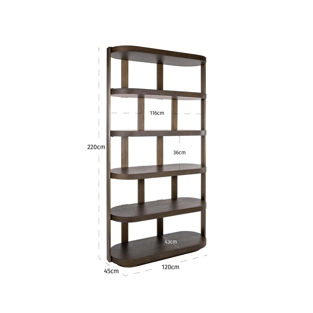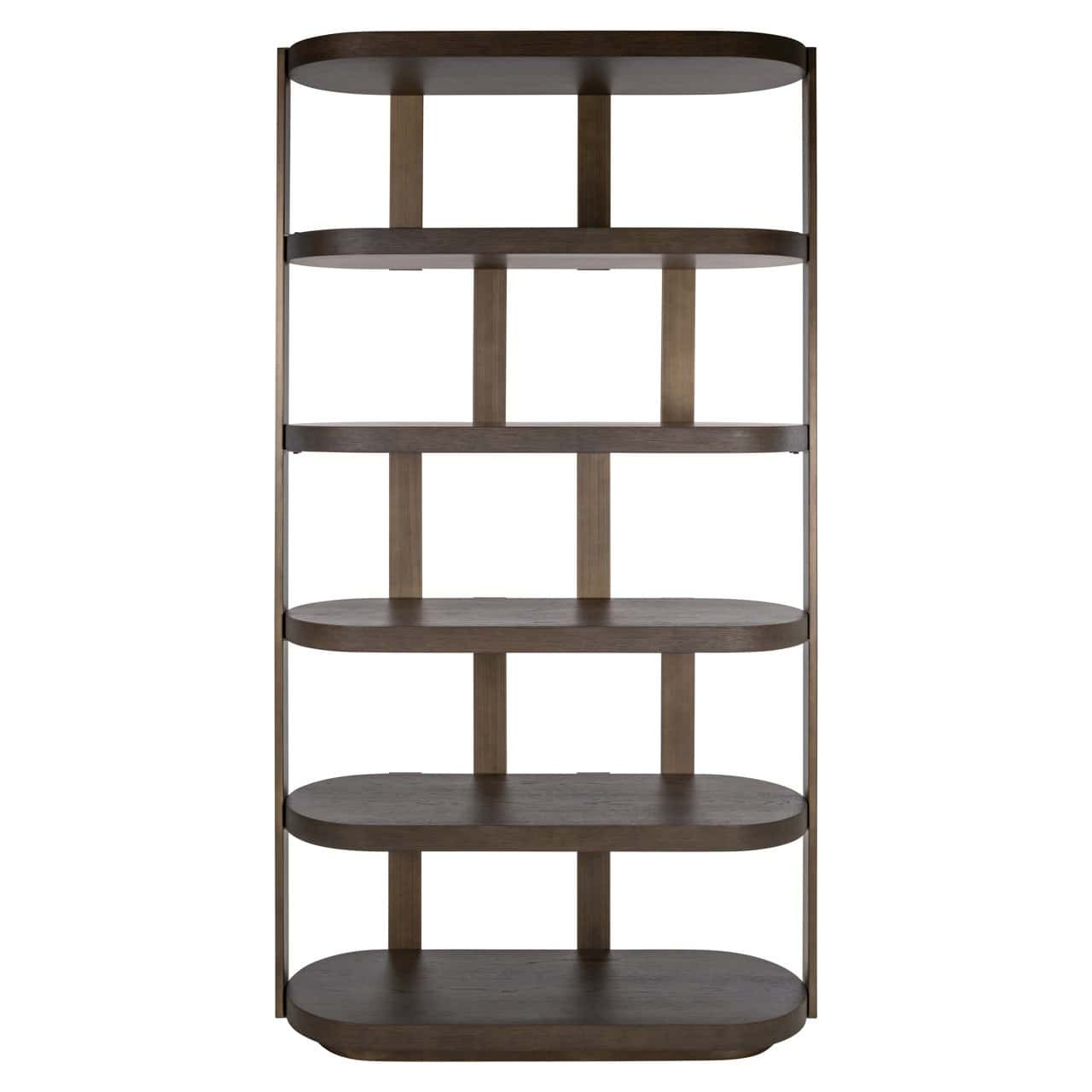 Crafted from oak veneer in a rich brown finish, its sturdy shelves feature softly rounded edges that lend a subtle mid‑century quality. The exposed metal frame and brackets introduce an architectural edge, enhanced by their staggered arrangement. Generous shelving provides ample space for displaying books, ornaments and photographs with style.