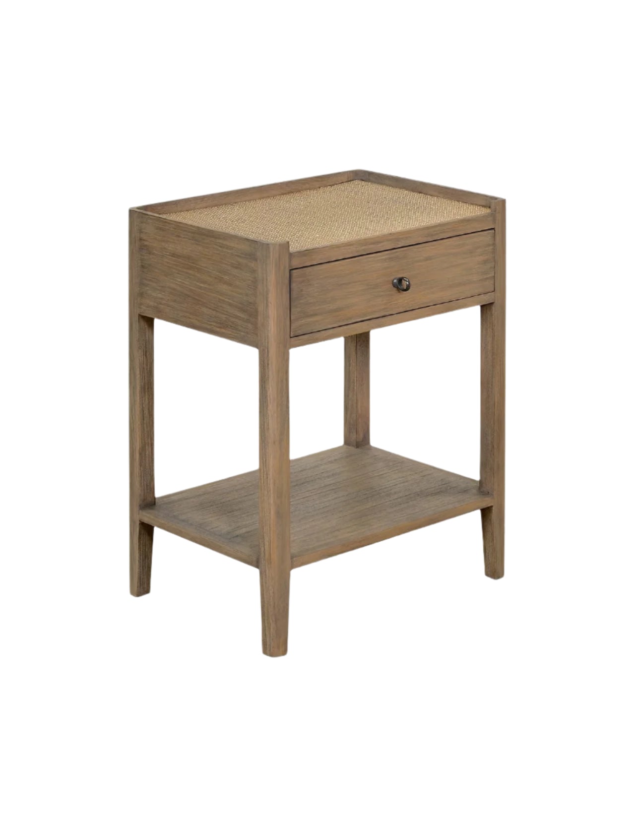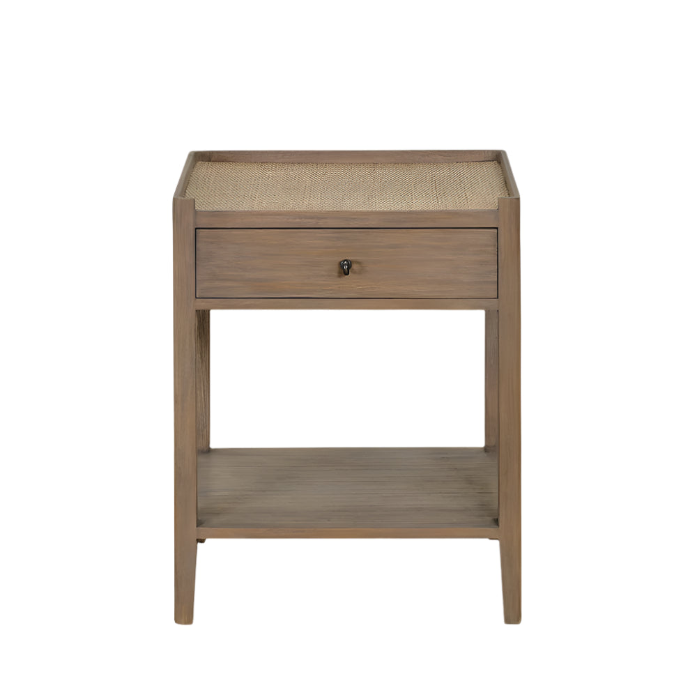 Crafted from bayur wood with a rich mindi wood veneer, its warm, organic finish celebrates the beauty of natural materials. The wicker rattan top introduces a tactile contrast, adding a hint of mid-century charm and bohemian texture. A lower shelf provides handy storage for books and board games while a single drawer provides discreet storage for essentials. The tabletop is perfect for lamps, alarm clocks, or decorative accents.