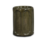 Crafted from durable concrete and finished in a glossy brown-olive enamel, it balances strength with standout style. The raised panel detailing adds rhythmic, architectural interest, while the smooth surface reflects light beautifully, enhancing its rich, tonal finish.