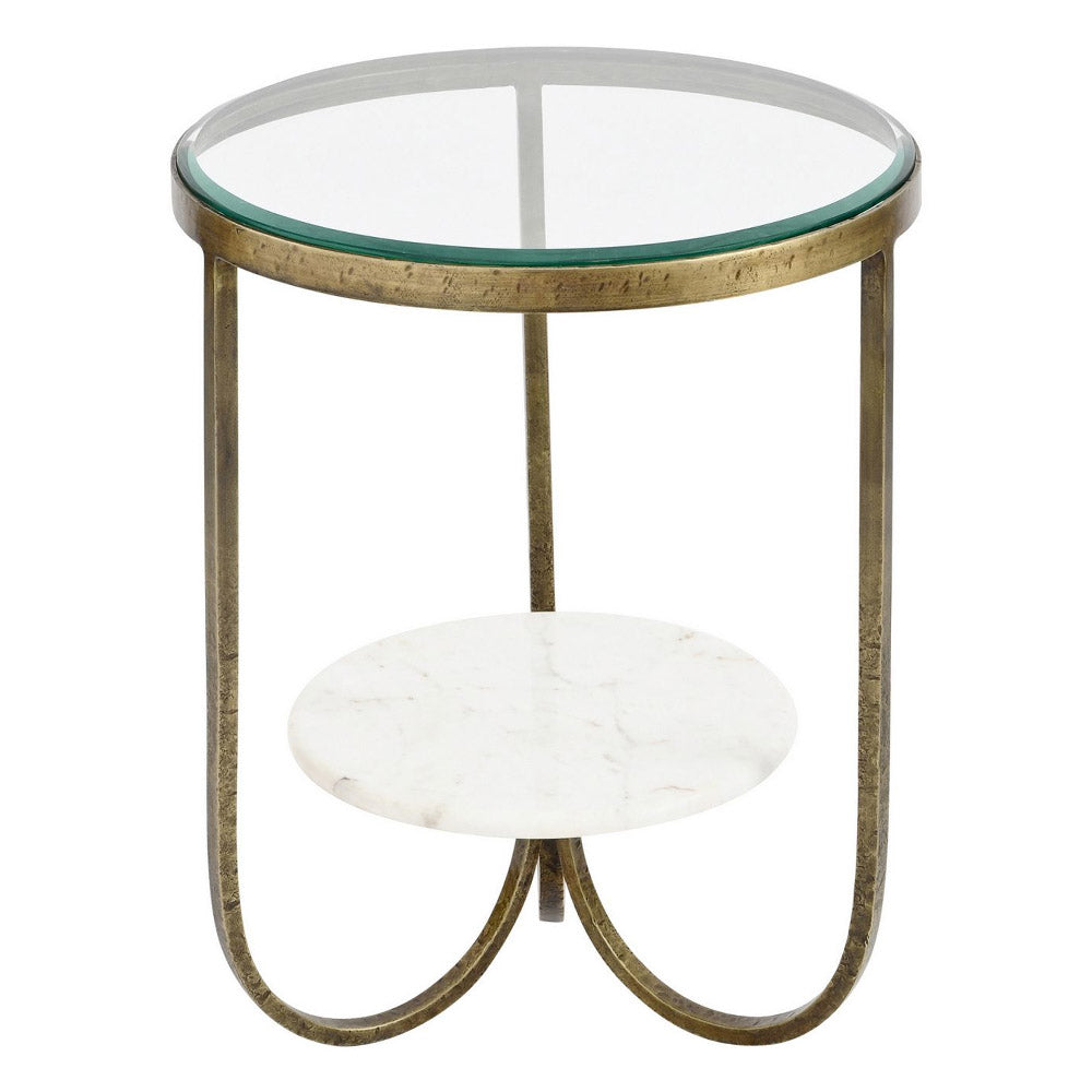 At the base, a sleek white marble shelf offers a luxurious accent and convenient space for decor or essentials, while the beveled glass top adds an airy, open feel. The sturdy antique gold iron frame with sculpted legs brings vintage charm, creating a beautiful balance of classic and contemporary style.