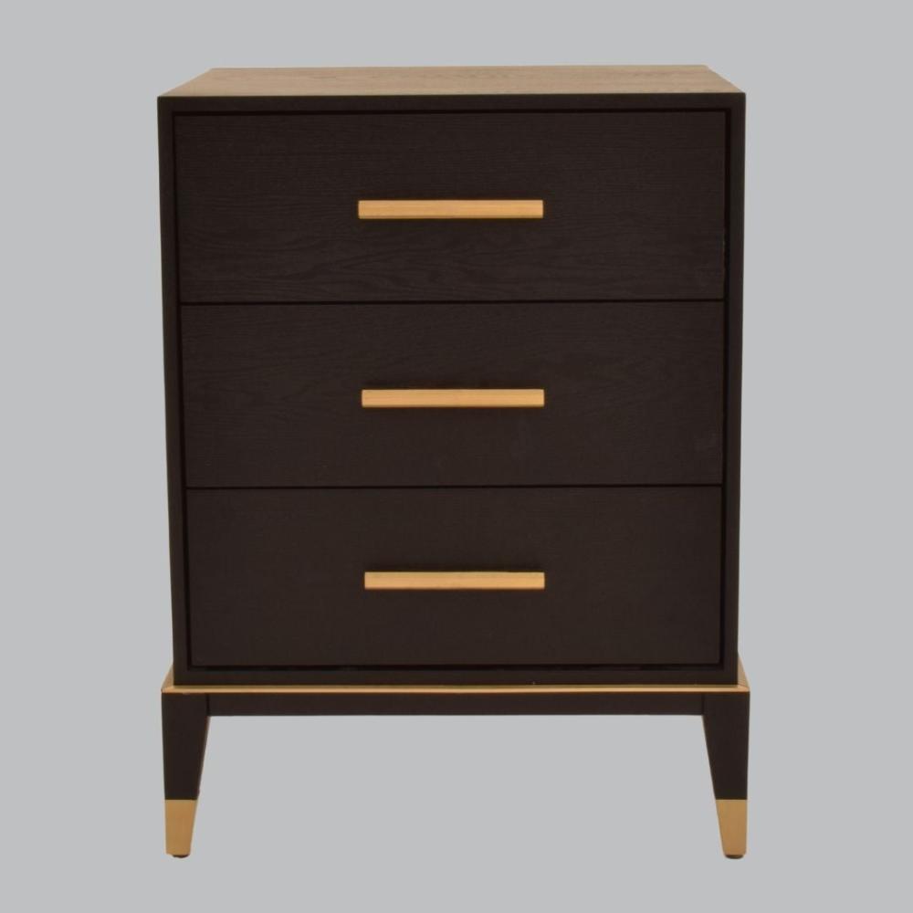 Made from luxurious ash veneer, this side table consists of a sturdy frame with three drawers, offering plenty of storage to keep your essentials close. Standing on four tapered legs, this piece is bold and sophisticated, accentuated by its classy black finish. For a sumptuous contrast, opulent brass highlights are applied throughout in the form of the three handles, trim, and feet of the piece.