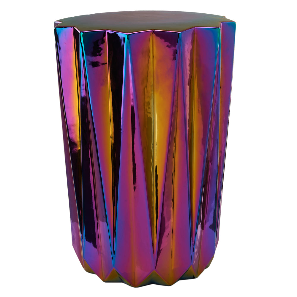 Crafted from stoneware, this exquisite piece captivates with its sharp angles and folds, taking on an almost sculptural presence. Its multi-coloured oily glaze adds a futuristic dimension, giving the table a distinctive, ever-changing aura.