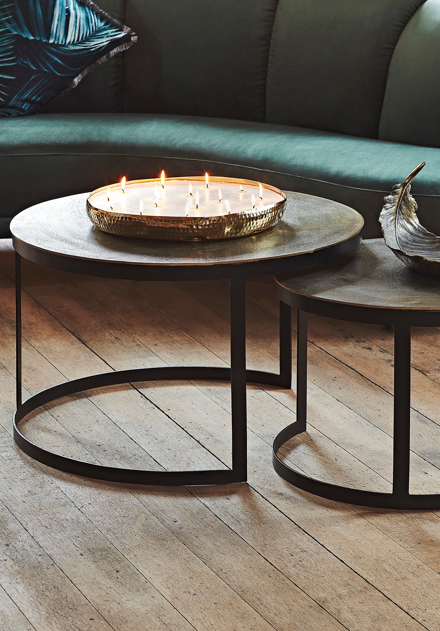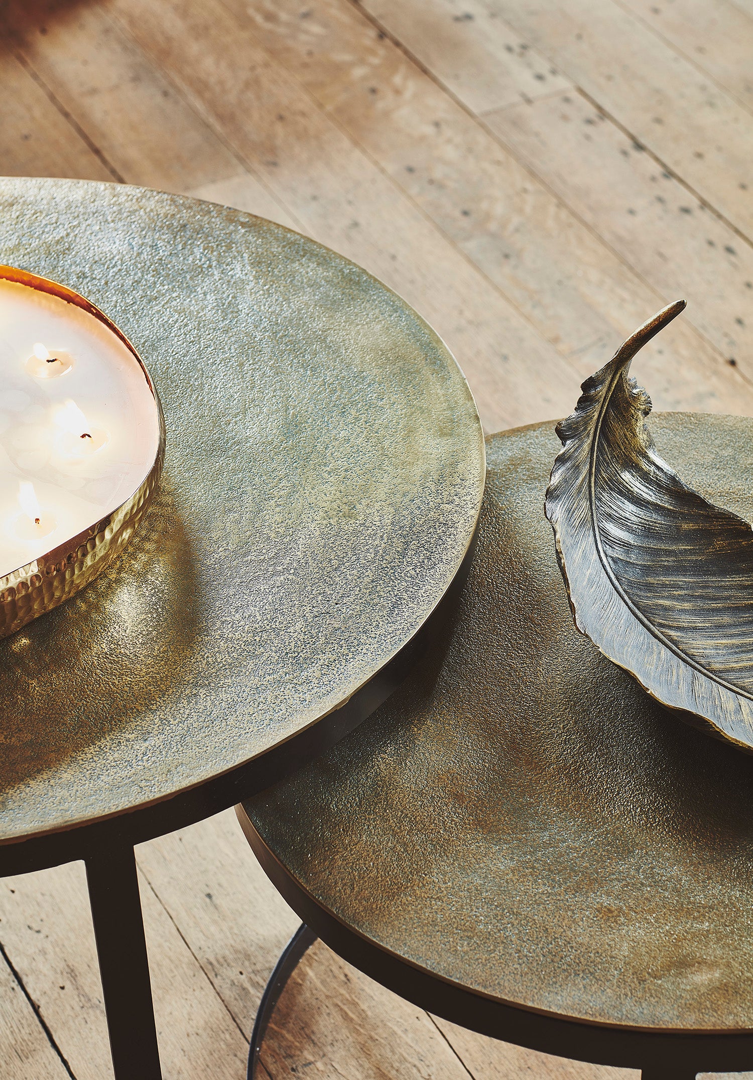 Expand the reach of your space and build an ornate elegance with the Terranis Nesting Tables. Each one has a superior curved metal stand presented in charcoal black. This only serves to increase the beauty of the brass table tops. They have been handcrafted with an antique style finish for stunning style and drama. These tables can be nested to take up very little floor space. Bring out the second one as and when needed or use its lovely form elsewhere in the home. Equally these tables would enhance an office space. Introduce them as part of a central seating area for an exceptional look.