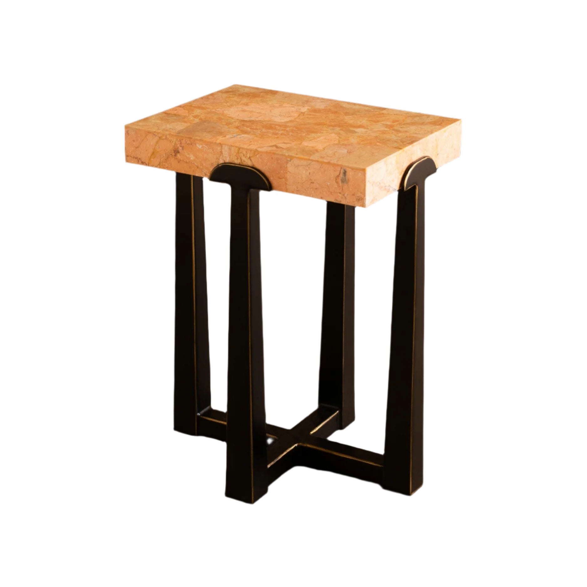 Sleek steel legs with an oil-rubbed bronze finish introduce a bold, brutalist edge, perfectly supporting the polished salmon marble top. The striking contrast of tones and textures brings depth, warmth, and character to your space.