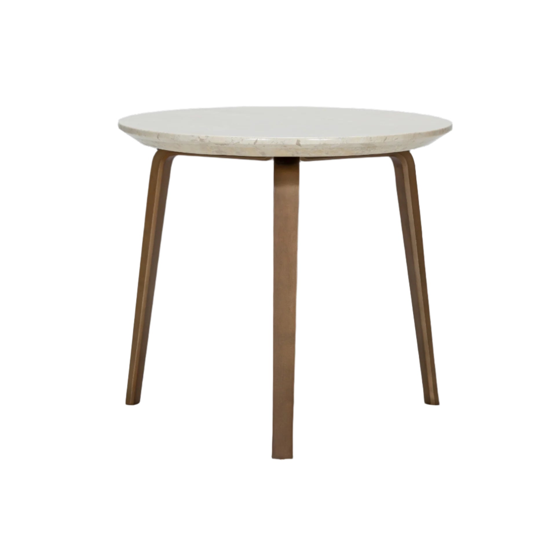 Supported by brushed brass-finished aluminium legs, it effortlessly combines modern sophistication with timeless charm. Its smooth beige Indonesian marble top radiates natural beauty, offering a refined surface for a lamp, decorative accents, or your favourite book.