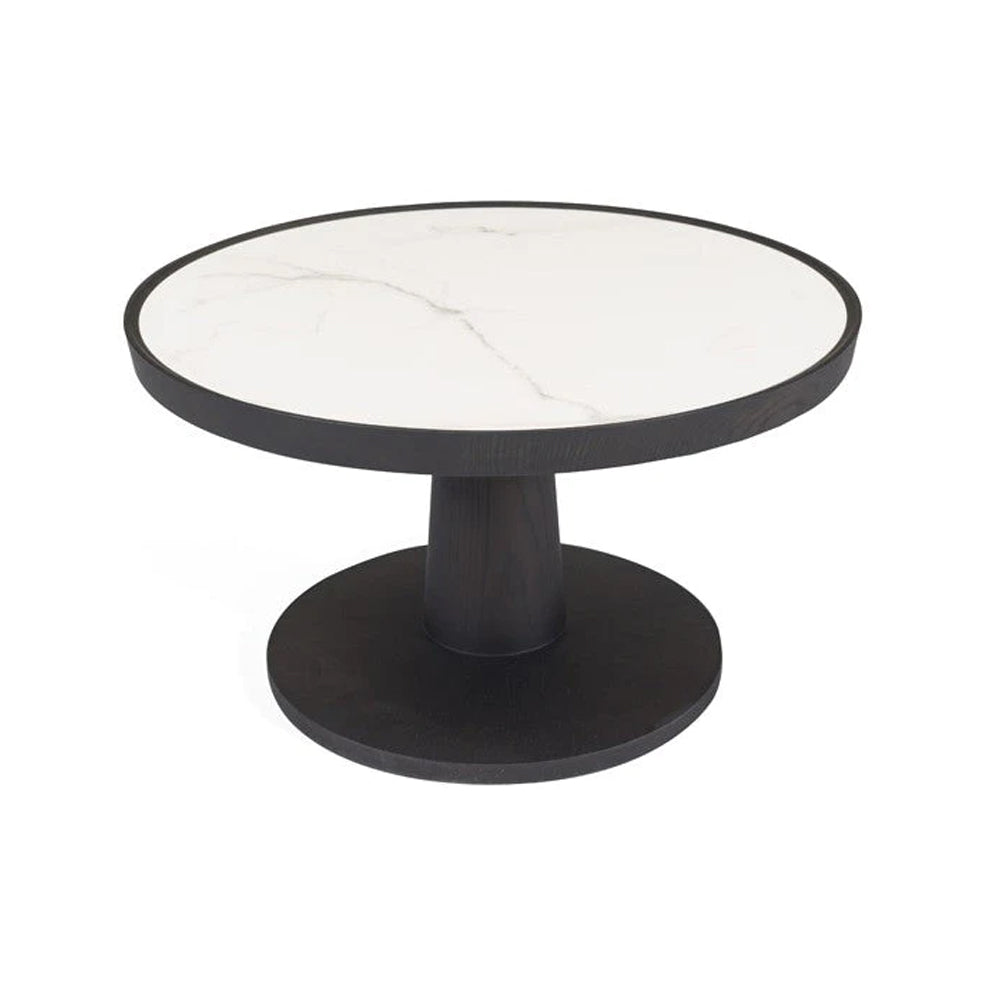 Its circular silhouette exudes a sense of grace, while the white ash stained dark coffee base adds a touch of sophistication and depth. Topped with exquisite Spanish ceramic, the table showcases intricate patterns that elevate its visual appeal. The sleek and minimalist lines of the design create a harmonious balance between contemporary aesthetics and functional utility.