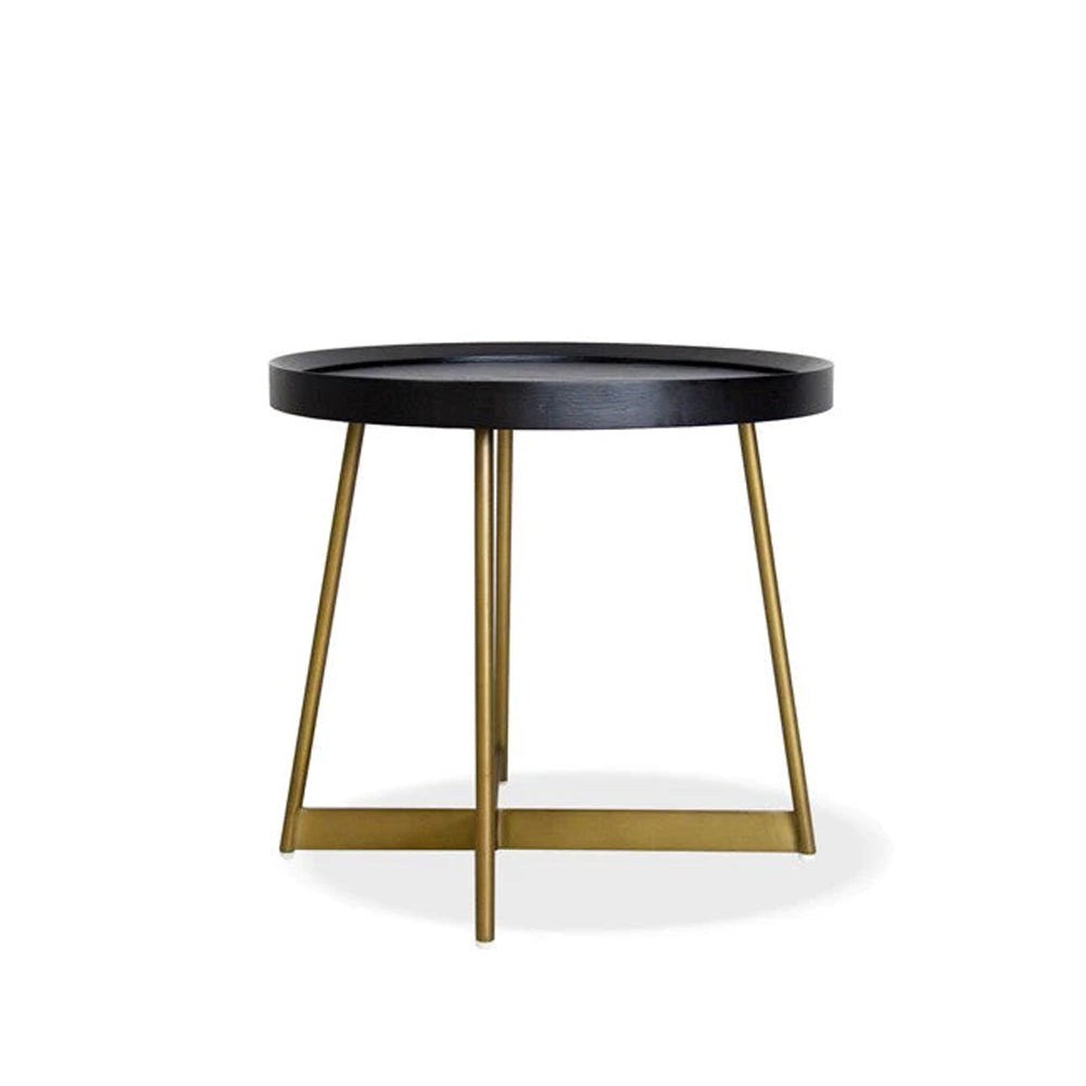Boasting an x-shaped, angled base in brushed gold, this table adds a touch of opulence to any room. Crafted from durable stainless steel, it provides a stable foundation, perfect for everyday use. The rounded smoked oak top complements the luxurious base, offering an ideal spot for your cup, TV remote, or cherished ornaments.
