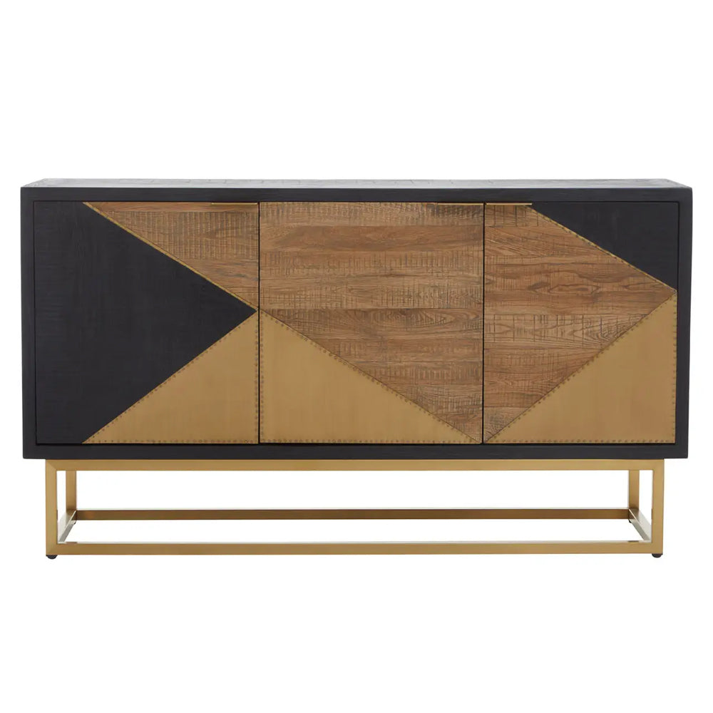Crafted from black and brown oak, this sideboard showcases a contemporary aesthetic, further accentuated by striking, geometric brass panels on the front. Its sturdy, gold-finish stainless steel frame stands as a testament to both strength and style. Inside you'll find plenty of shelved storage to keep your space free from clutter.