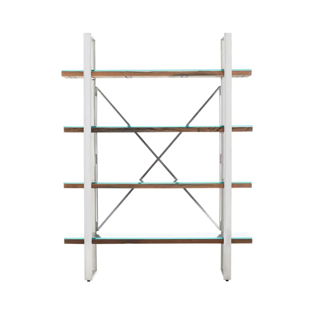 This unit features four spacious tiers, each supported by an elegant silver frame that creates a visually stunning contrast with the natural wooden shelves. The top surface of each shelf is crafted from sleek glass for easy upkeep. Its distinctive design not only radiates a modern charm but also incorporates an industrial edge, making it versatile enough to complement a range of interior styles, from urban lofts to minimalist living spaces.