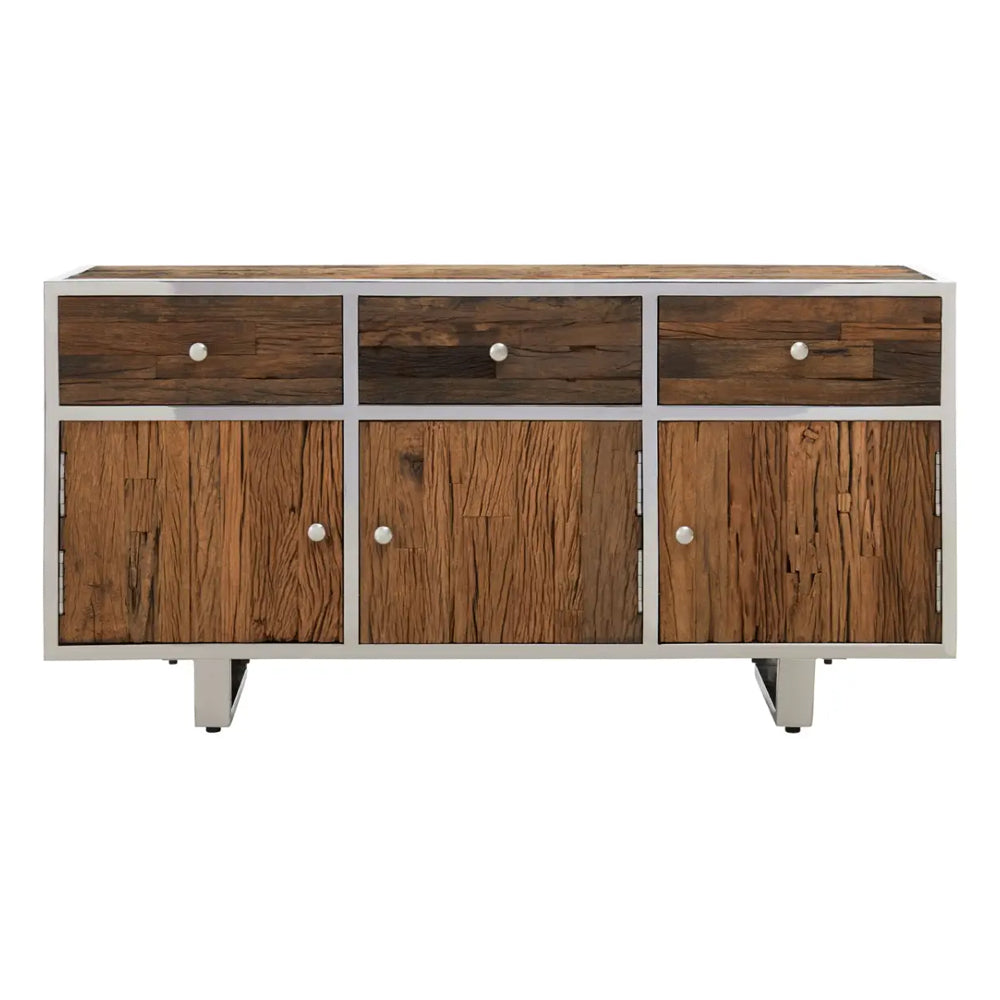Crafted from natural wood with a sleek glass top and elegant silver accents, this sideboard offers an exceptionally sophisticated look. It features a trio of doors and drawers which open to reveal ample storage space to help keep your space neat and tidy. Dress it up with your favourite ornaments, photographs, and floral arrangements for a stunning result.