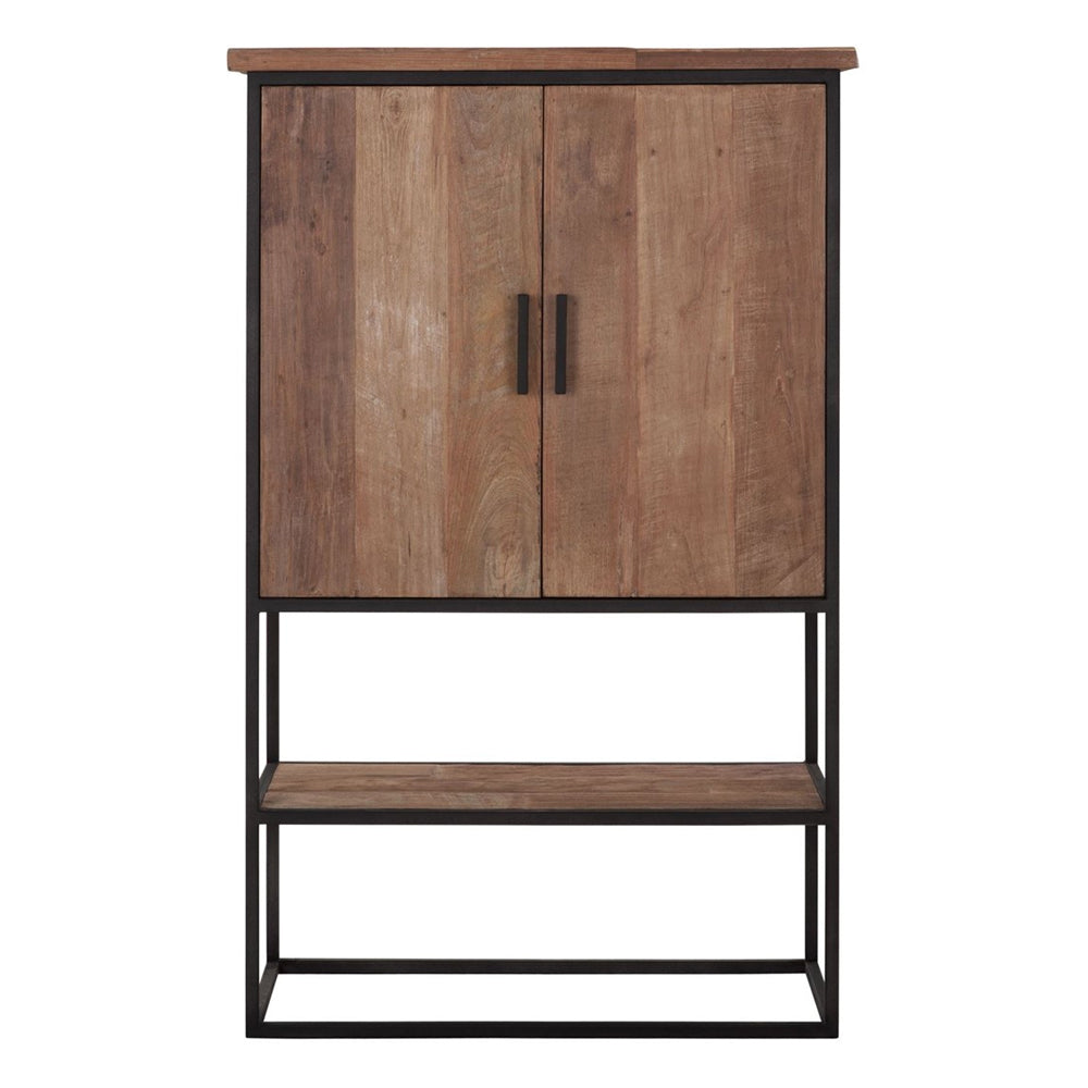 Proudly standing on a sleek metal frame, this cabinet boasts stylish recycled teak wood construction, beautifully treated to a natural finish with clear varnish to highlight its organic allure. It offers versatile storage solutions, featuring two doors and an open shelf perfect for both stowing away essentials and showcasing decorative items.
