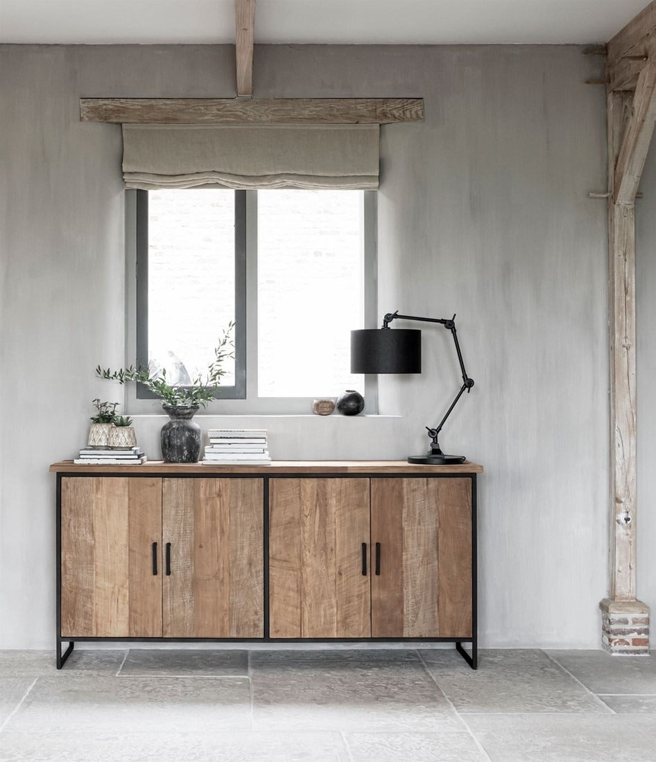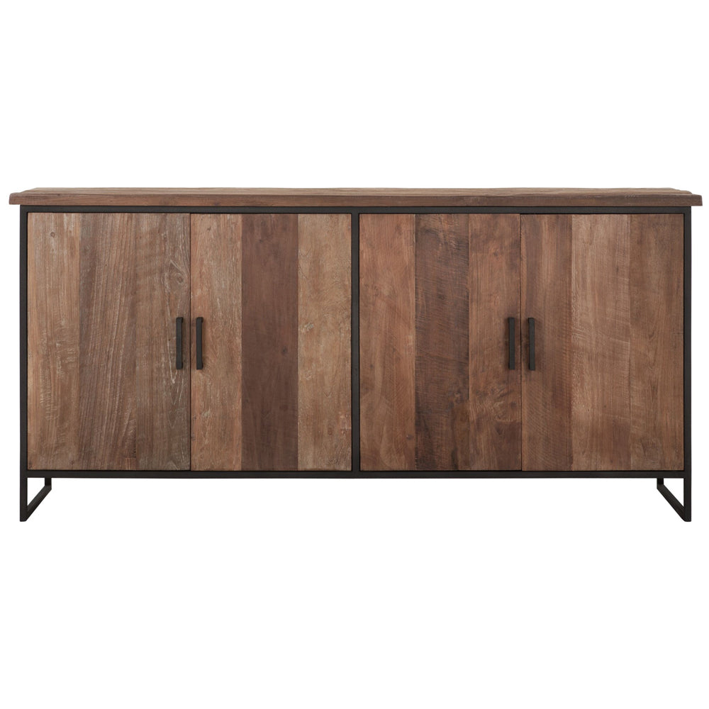 Expertly crafted from recycled teak wood, this chunky sideboard boasts a sophisticated natural finish and a transparent varnish that not only protects but also accentuates its natural grain and unique imperfections. Resting on sleek metal legs that introduce a hint of industrial elegance, it features four doors which open to reveal generous storage space. The smooth top invites personal decoration, making it a versatile addition to any decor style, from contemporary to traditional.