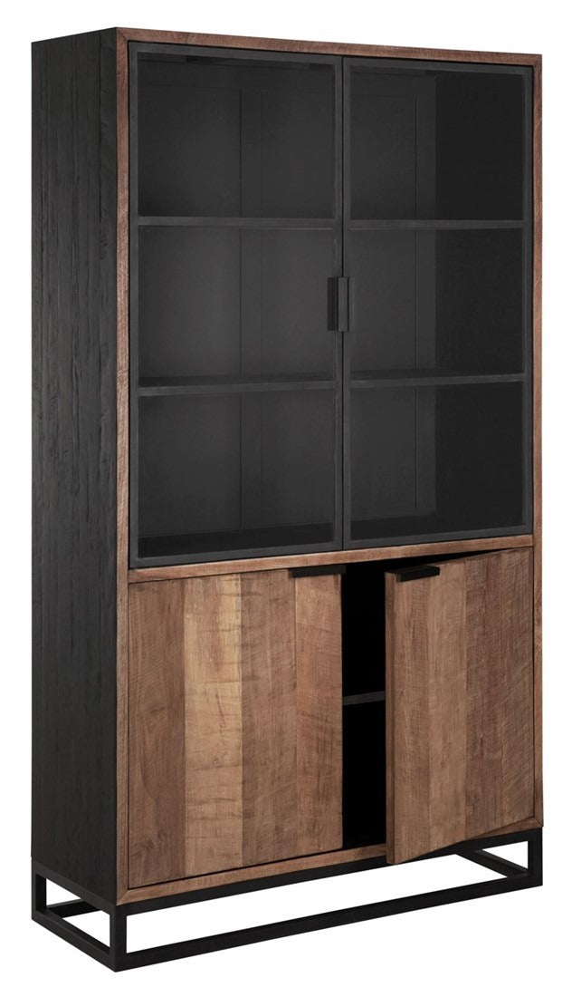 Standing on a sleek metal base, this unit masterfully combines the rustic warmth of recycled teakwood with the modern edge of glass. The result is a captivating contrast that commands attention. At its base, two wooden doors provide discreet storage, while the shelved interior offers ample display space. With two glass doors, the unit invites light to illuminate your cherished ornaments, displaying them beautifully while ensuring their protection.