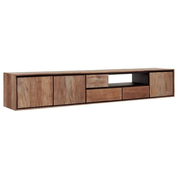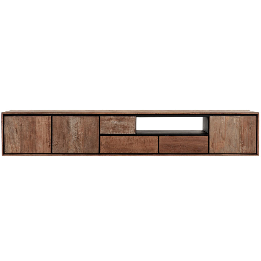 Featuring a flat base, this tv unit can either sit on the floor, or fixed to the wall for added versatility. It showcases the warm, natural allure of recycled teakwood, subtly finished to enhance its organic texture. The design is brought to life with striking black accents, providing a bold contrast that accentuates its simple, yet sophisticated silhouette.