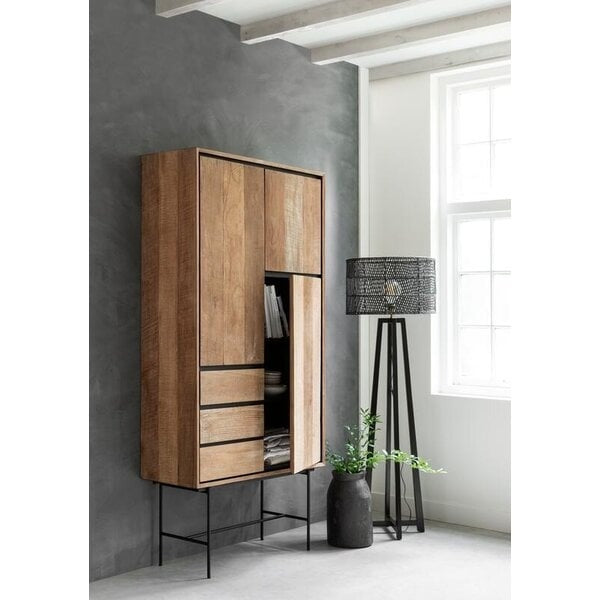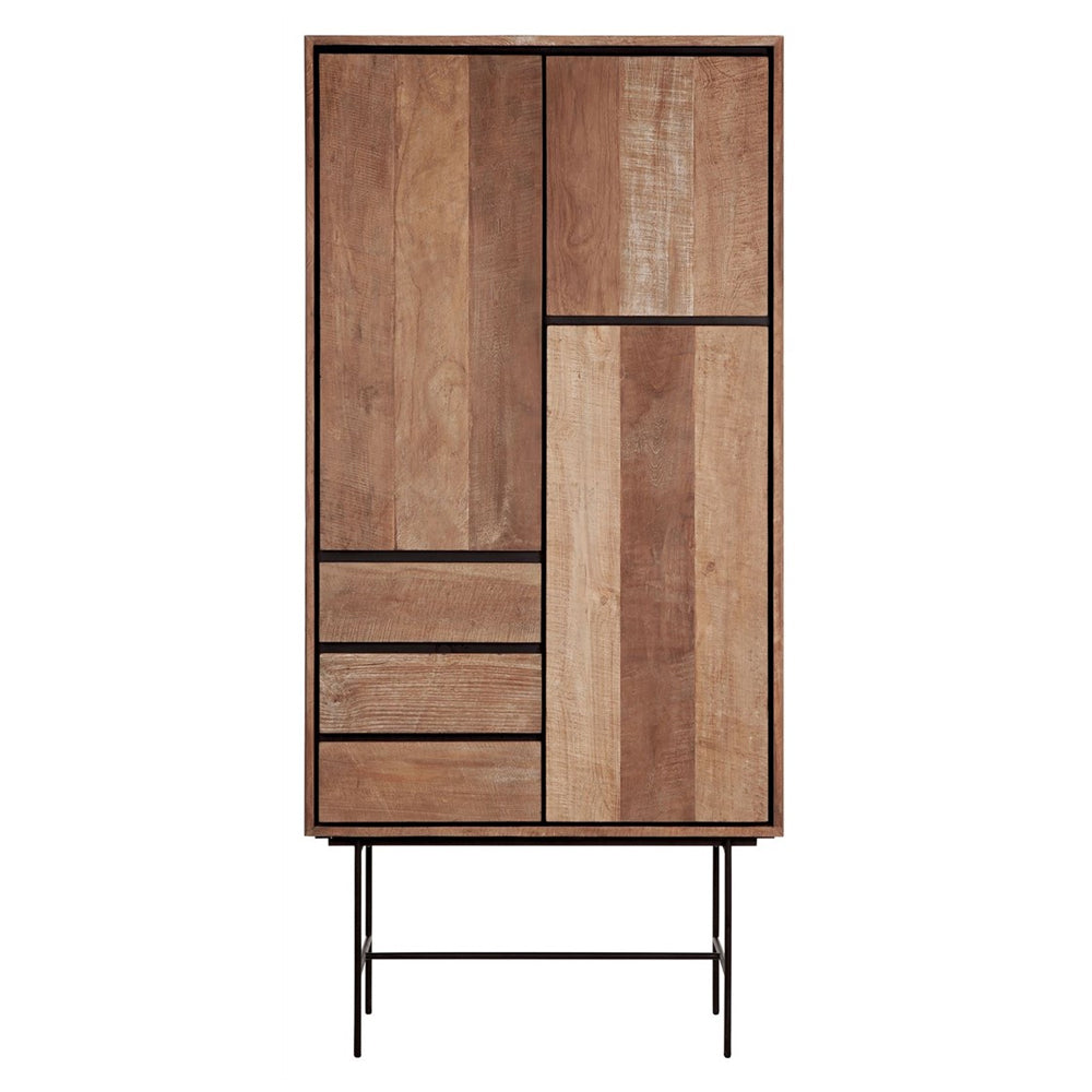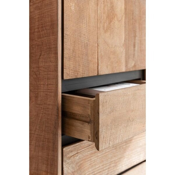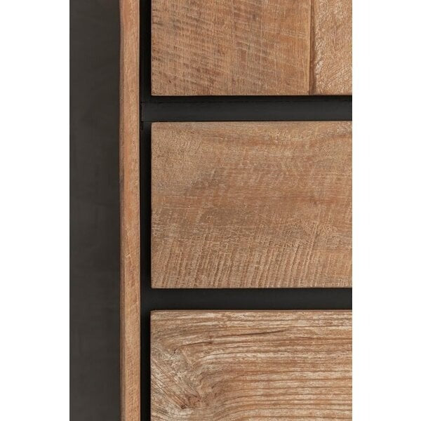 Elevated on four slender, metal legs, this piece introduces a contemporary edge, beautifully juxtaposing its rustic recycled teakwood construction. The cupboard's natural finish enhances the wood's natural grain, adding depth and warmth, while elegant black accents provide a refined contrast. With three doors and three drawers for storage, it ensures a clutter-free environment.