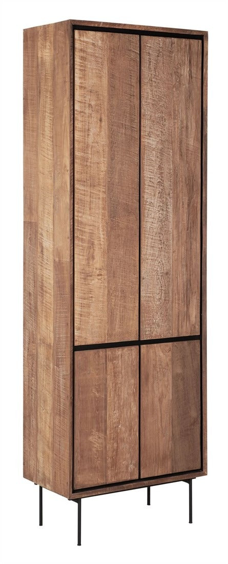 Elevated on four slender, metal legs, this piece introduces a contemporary edge, beautifully juxtaposing its rustic recycled teakwood construction. The cupboard's natural finish enhances the wood's natural grain, adding depth and warmth, while elegant black accents provide a refined contrast. With four doors which open to reveal shelved storage, it ensures a clutter-free environment.