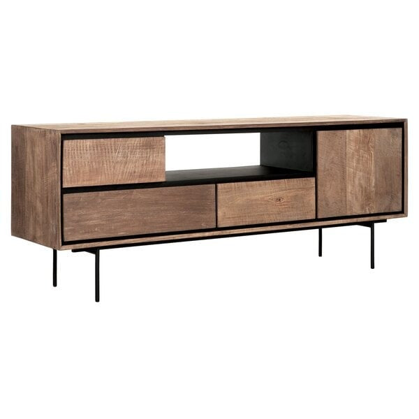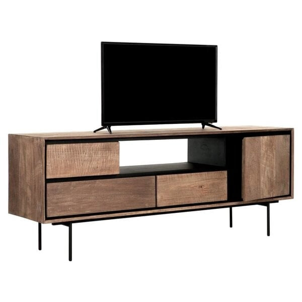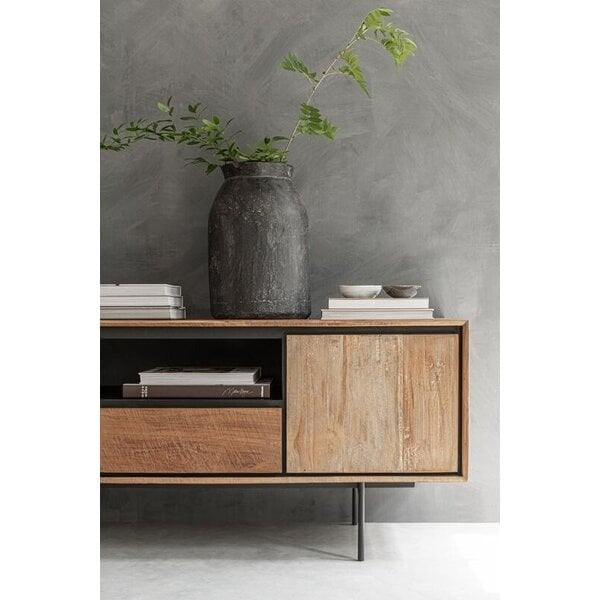 Supported by four slender metal legs, this TV unit showcases the warmth and natural beauty of recycled teakwood, enhanced with a rich, natural finish. The design is thoughtfully contrasted with striking black accents, adding a modern twist to its organic appeal. Equipped with one door and three drawers, it offers practical storage solutions whilst maintaining sleek, clean lines that will complement your space.