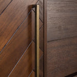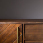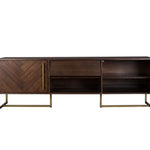 Expertly crafted from acacia veneer, it showcases clean lines and sharp angles that balance Scandinavian simplicity with mid-century charm. Two doors, each finished with herringbone detailing and sleek metal handles, conceal spacious shelved storage, while the central compartments provide additional shelving complete with a cut-out for discreet media wire management.