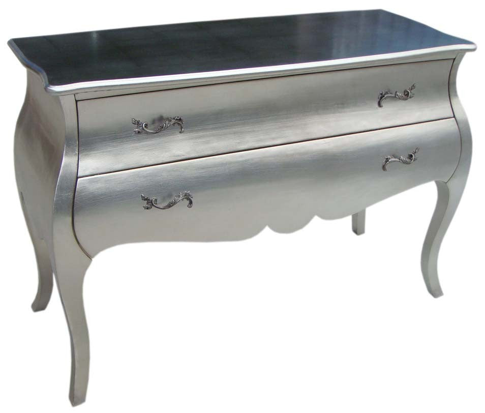 A breathtaking shabby chic Queen Anna Limoges silver painted two drawer chest of drawers, which is French in style. This beautiful wide silver chest of drawers has been made from mahogany and has been hand finished in a slightly distressed silver leaf.