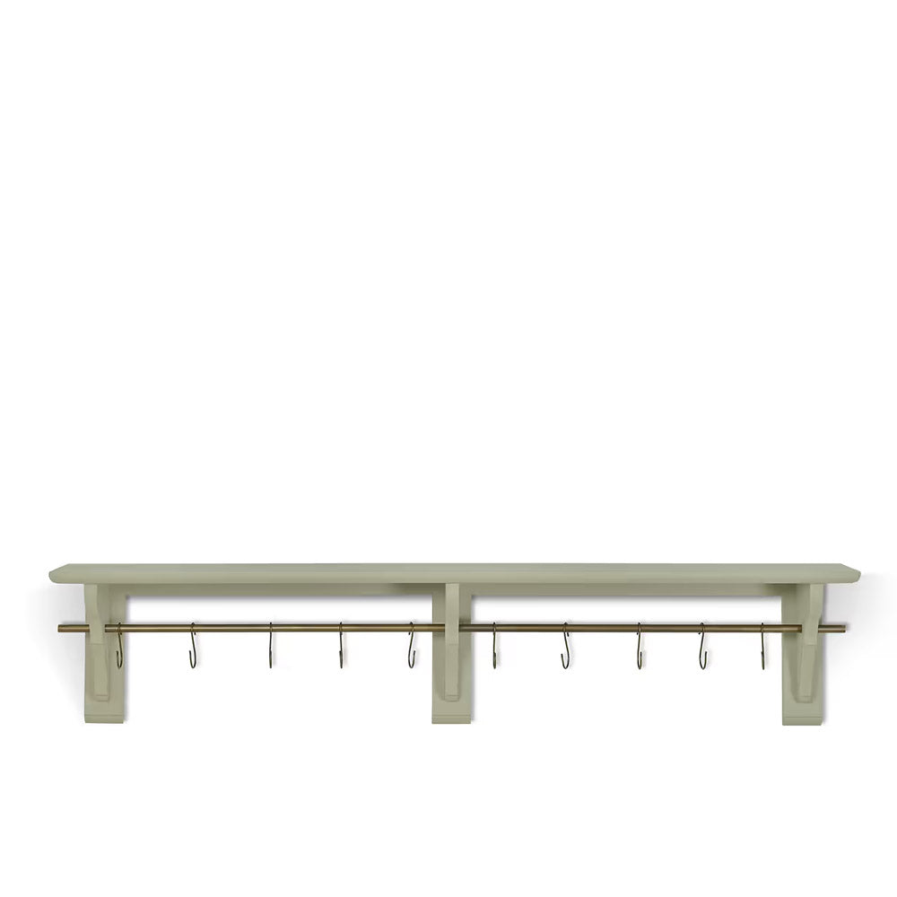 Made from durable mahogany wood with a clay finish, this elegant shelf complements both traditional and modern interiors. The sturdy top provides ample space for displaying cookbooks, spices, or decorative pieces, keeping essentials easily accessible. Below, an antique brass rail with ten hooks offers versatile storage for utensils, oven gloves, or tea towels, combining practicality with aesthetic appeal.
