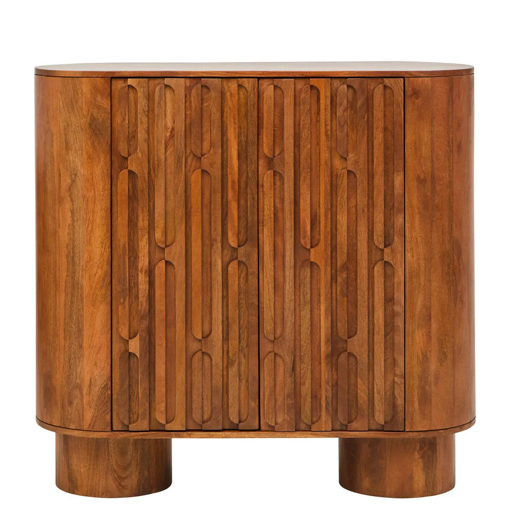 This two-door cabinet stands on sturdy pillar feet and showcases a rich mango wood frame that highlights mid-century design influences. The carved geometric patterns on the doors add texture and personality, while the smooth top provides a sophisticated contrast. Inside, the shelved storage helps keep your essentials organised and out of sight.