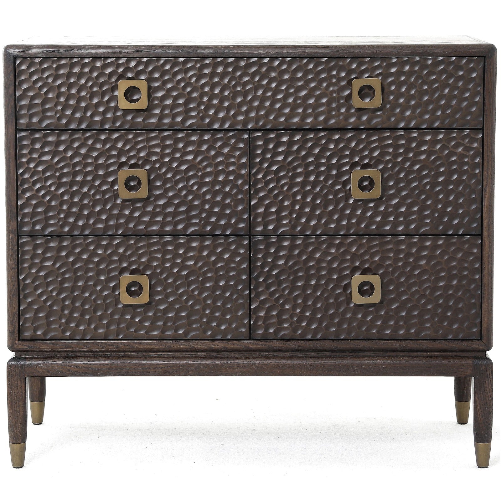 Crafted from dark-finished wood, its standout feature lies in the hammered oak veneer drawer fronts, each fitted with square antique brass metal handles for a touch of classic elegance. With five spacious drawers, it offers ample storage for clothing, bedding, and everyday essentials, helping to keep your space organised and clutter-free.