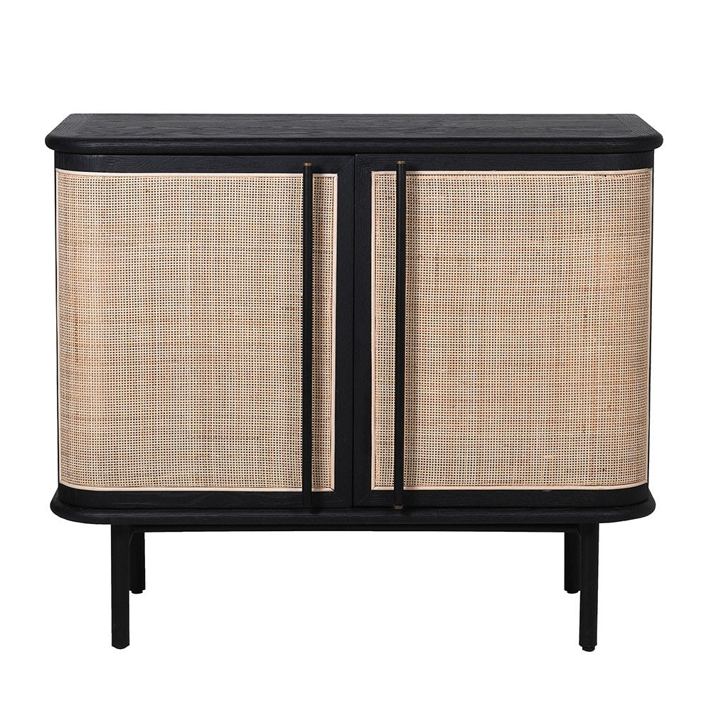 Crafted predominantly from black oak, this sideboard exudes a sense of robust elegance. Its aesthetic appeal is enhanced by metallic highlights that adorn the legs and handles, adding a touch of refined glamour. The front of the sideboard features a beautifully woven cane lining, creating an organic, tactile appeal. This two-door sideboard opens up to a spacious shelved interior, ideal for organised storage. The top surface offers a canvas to express your personal style, be it with photographs, vases, or any decorative items of your choosing.